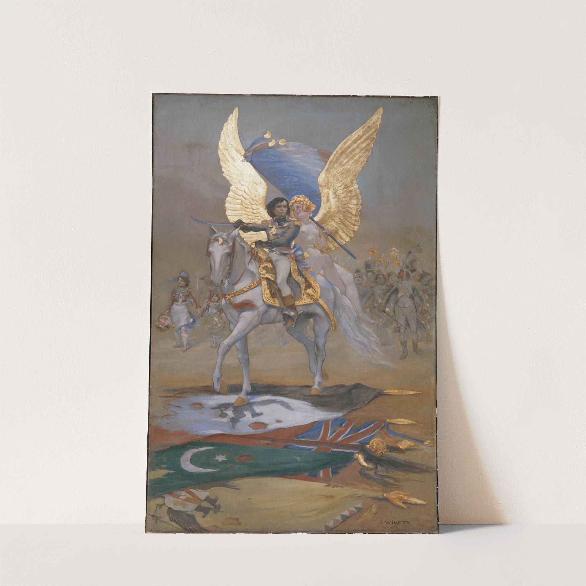 This art print features "Enseigne De La Maison Lempereur, Autrefois Rue Bonaparte" by Adolphe Léon Willette. It showcases a striking depiction of a mythical scene where a regal figure with radiant golden wings rides a white horse adorned in ornate...