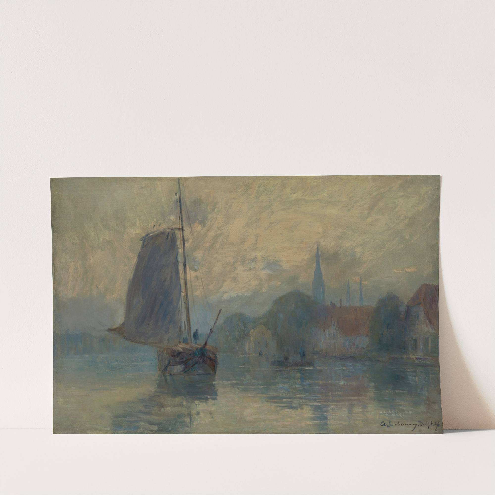 This captivating art print, titled "Bords de la Schie ? Delft, effet de brouillard" by Albert Lebourg, showcases a serene maritime scene. The composition features a solitary sailboat gliding across calm waters, its dark sails contrasted against the softly illuminated...