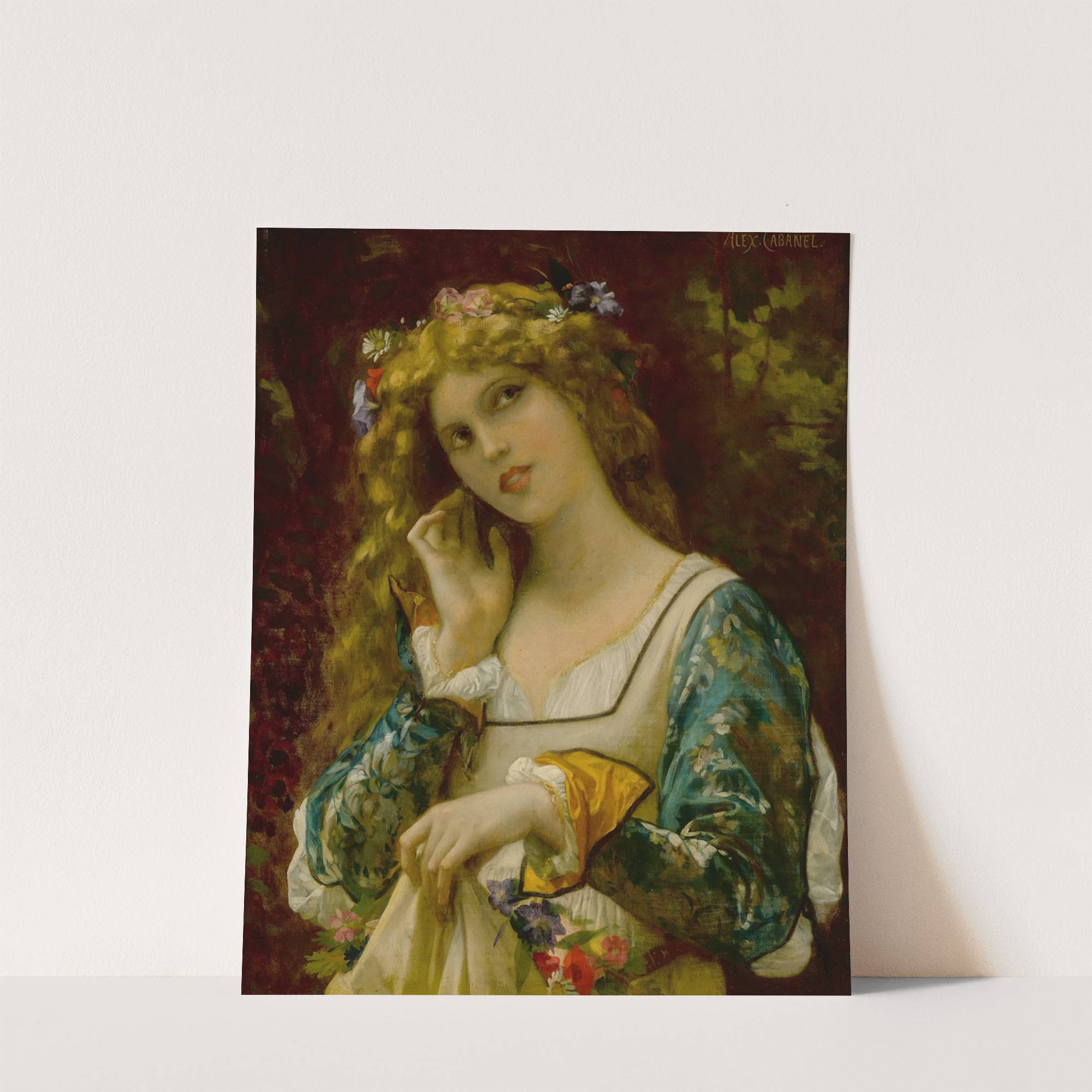 This artwork, titled "Écoutant La Voix D'Echo" by Alexandre Cabanel, features a captivating portrait of a young woman with flowing golden hair adorned with a colorful floral wreath. Her delicate, fair skin is softly illuminated against a rich, dark brown...