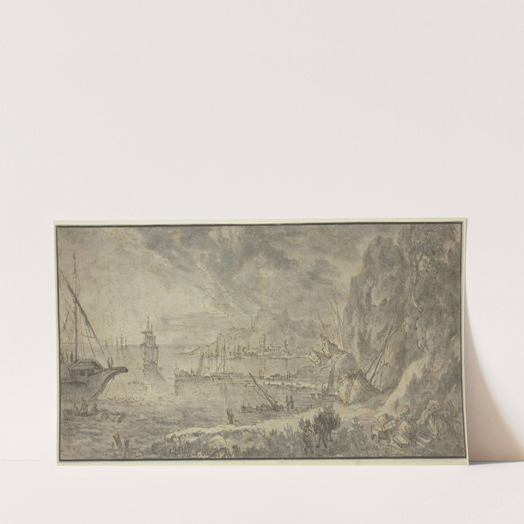 Marine, rechts große Felsen, vorn ein Maultiertreiber, im Hintergrunde eine Stadt by Claude Lorrain - Wall Art Print