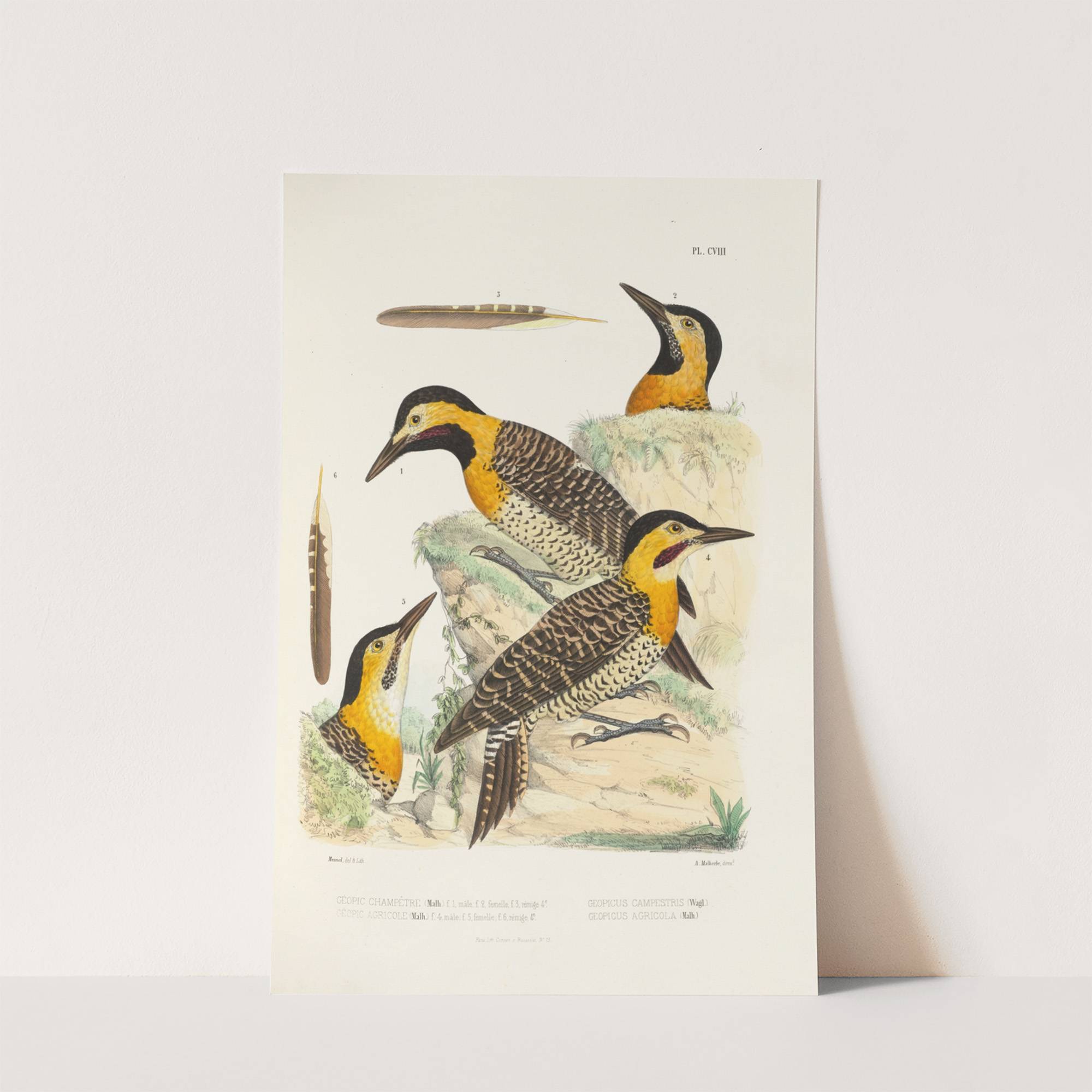 This striking art print features "Monographie des picidées pl37" by Alfred Malherbe, capturing the vibrant beauty of three orange-bellied kingfishers in a natural setting. The birds are depicted with meticulous attention to detail, showcasing their bright orange faces and necks...