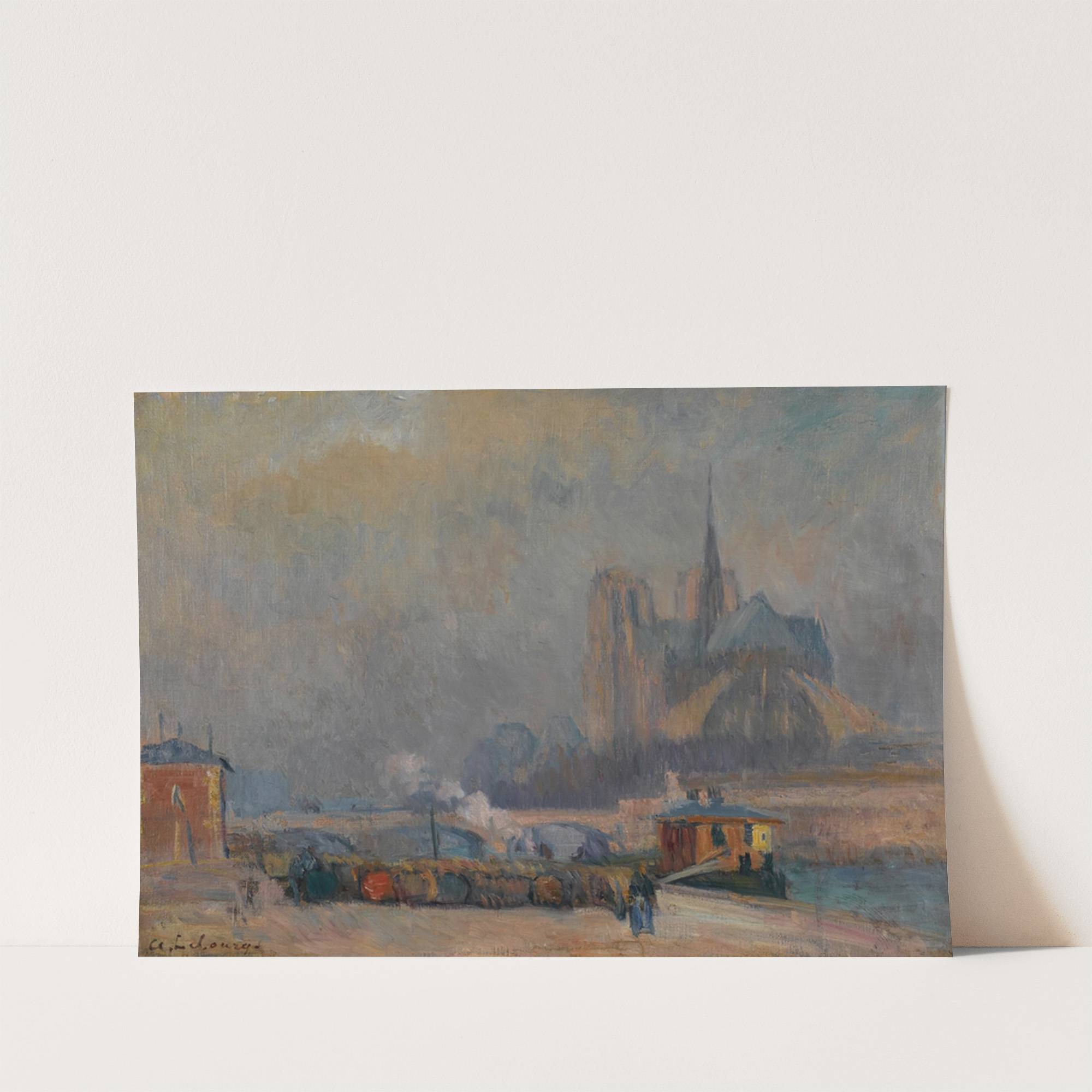 This art print captures "Notre-Dame De Paris Vue Du Quai De La Tournelle" by Albert Lebourg in vibrant, impressionistic style. The painting features a misty, twilight scene of Paris with the iconic Notre Dame Cathedral standing tall in the background....