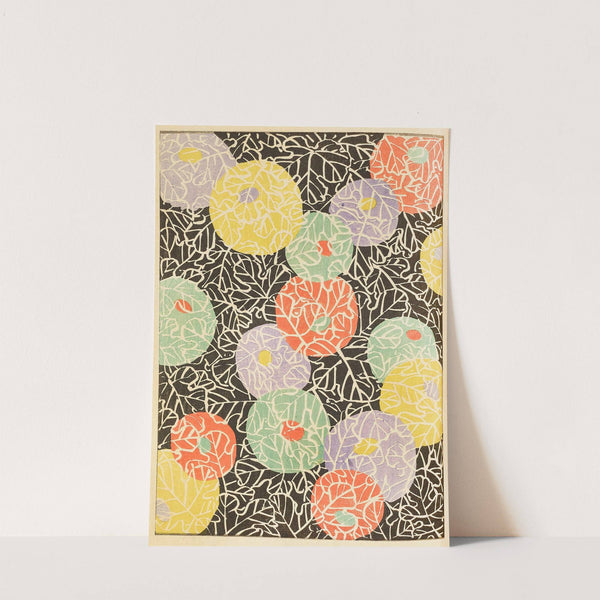 This vibrant abstract print features a dynamic composition of colorful floral elements set against a dramatic black background. The artwork, created by the artist Furuya Kōrin in 1901, showcases a lively array of flowers rendered in various hues, including bright...