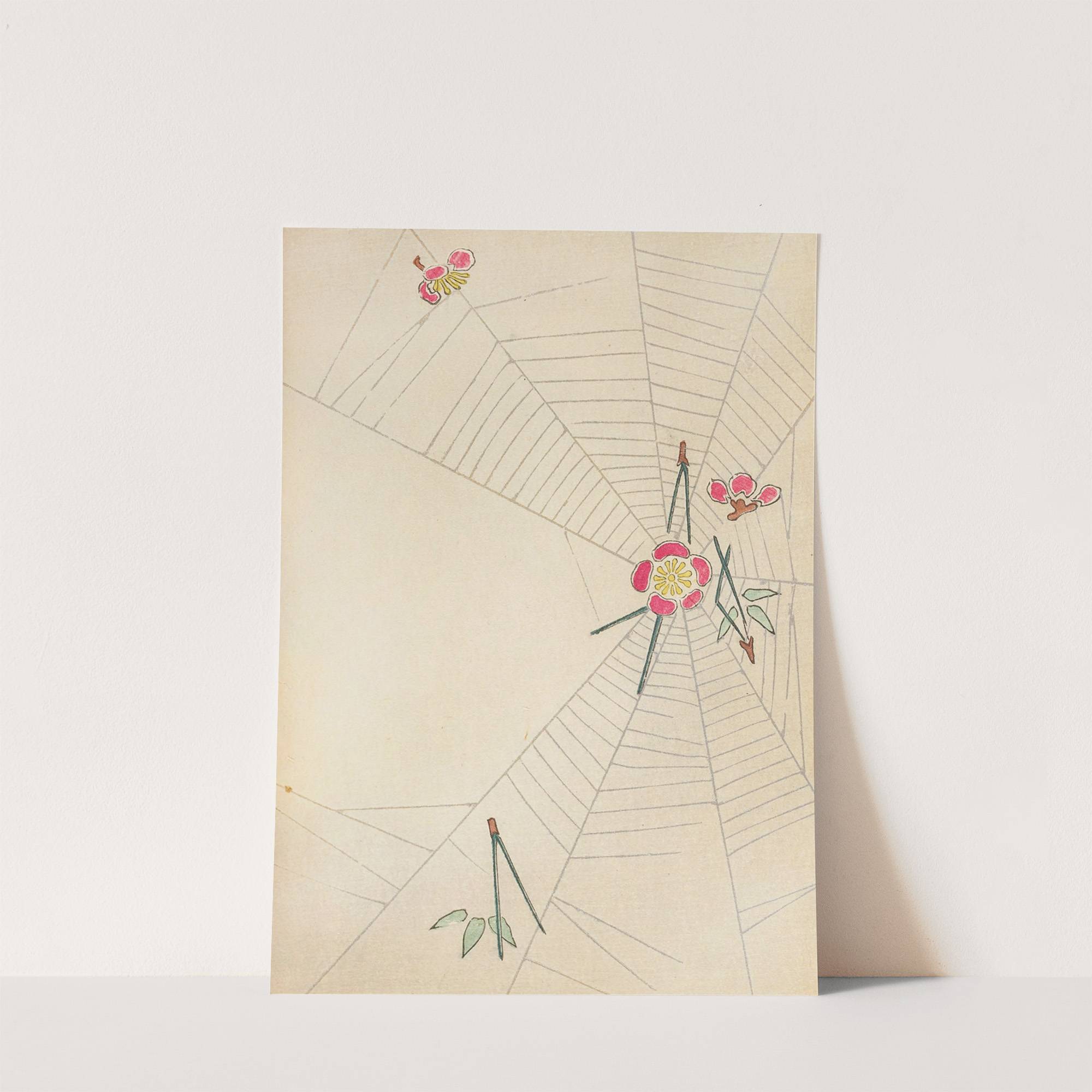 This artwork, titled "Bijutsuka Pl.38" by Furuya Kōrin from 1901, is a delicate and captivating hand-drawn piece that showcases the intricate beauty of spider webs. The composition features a central web adorned with small, vividly colored flowers in pink and...