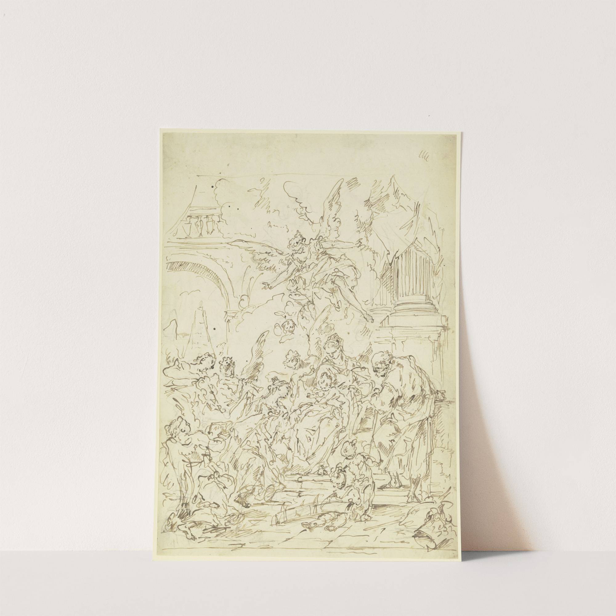 This intricately detailed monochrome sketch captures "Die mystische Vermählung der Heiligen Katharina" by the artist Gaspare Diziani. The drawing features a dynamic assembly of figures in various poses, creating a vibrant scene filled with movement and emotion. In the foreground,...