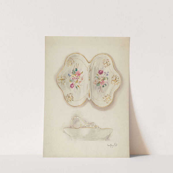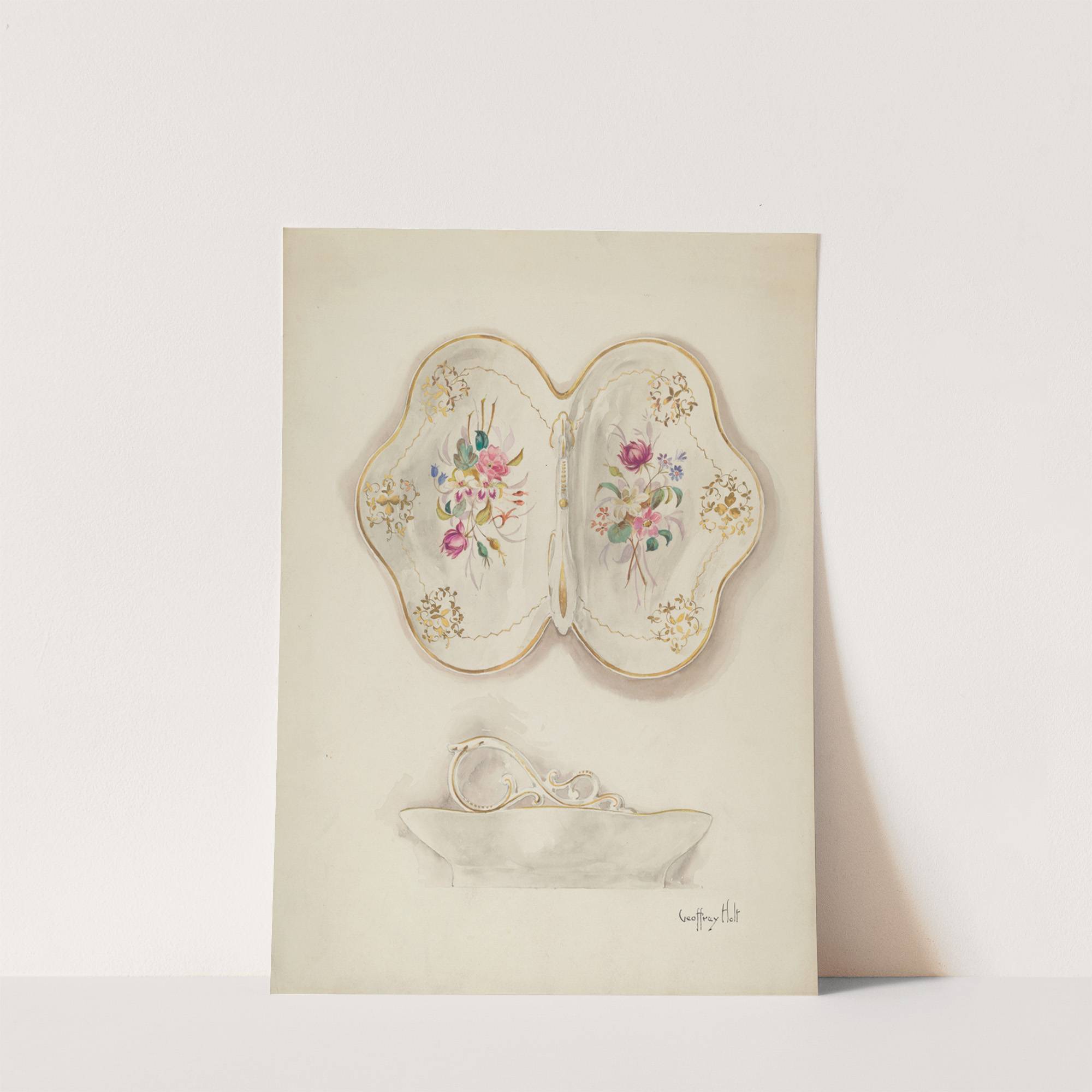 This exquisite artwork, titled "Bowl" by Geoffrey Holt, features a delicate and charming illustration of two vintage porcelain plates with ornate floral patterns. Each plate is beautifully adorned with a variety of colorful flowers in shades of pink, blue, yellow,...