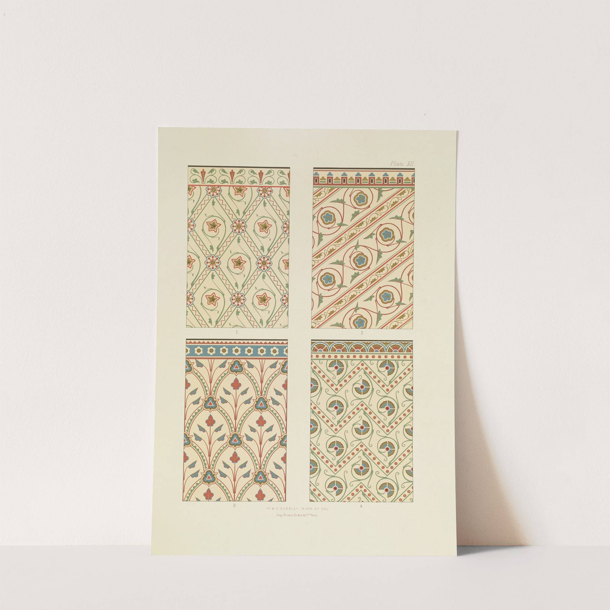This elegant artwork showcases four distinct, intricately patterned designs inspired by medieval art styles. Each section features vibrant, harmonious colors including soft cream backgrounds accented with red, blue, and green hues. The top left design features a repeating floral motif...