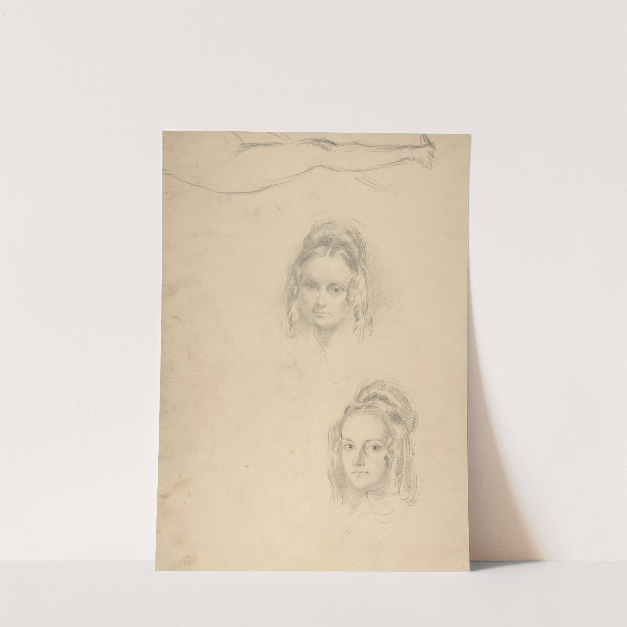 This art print features two meticulous pencil sketches of a woman's face, created in a classic realist style. The upper sketch showcases the subject with her hair elegantly pinned up, while the lower sketch presents her with slightly loose curls...