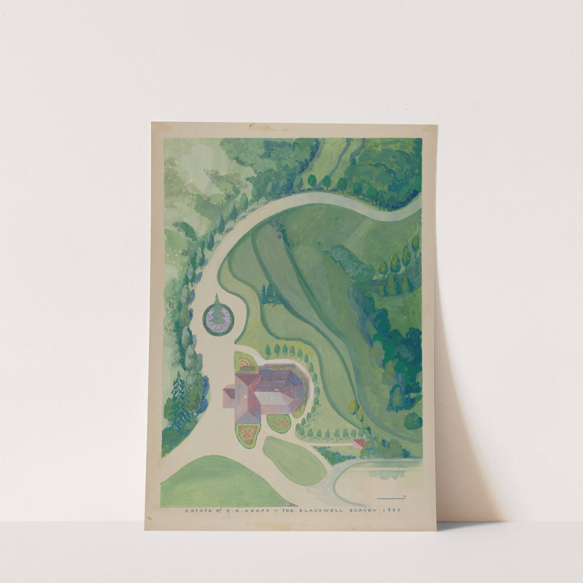 This vibrant watercolor painting by Peter K. Knapp Estate captures the serene landscape of "Harvest of Dreams" from Spring 1919. The artist skillfully depicts a winding driveway leading to a small, red-roofed house nestled amidst lush greenery. Surrounding the house...