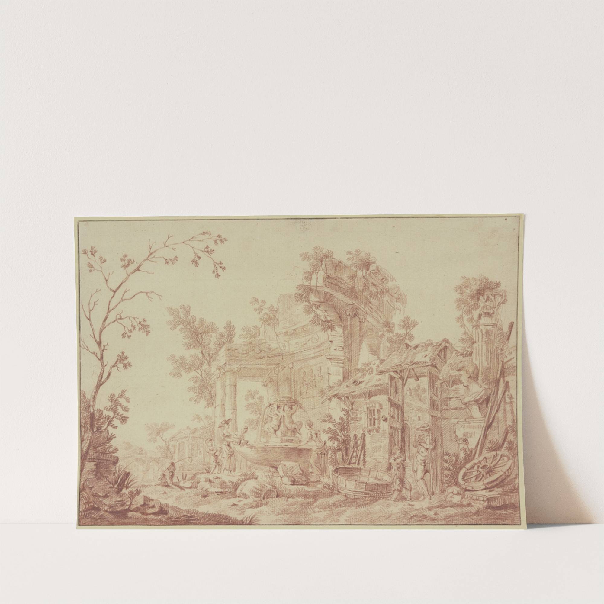 Unter römischen Ruinen ein Brunnen mit zwei Amoretten, an welchem Wäscherinnen beschäftigt sind by Georges-François Blondel - Wall Art Print