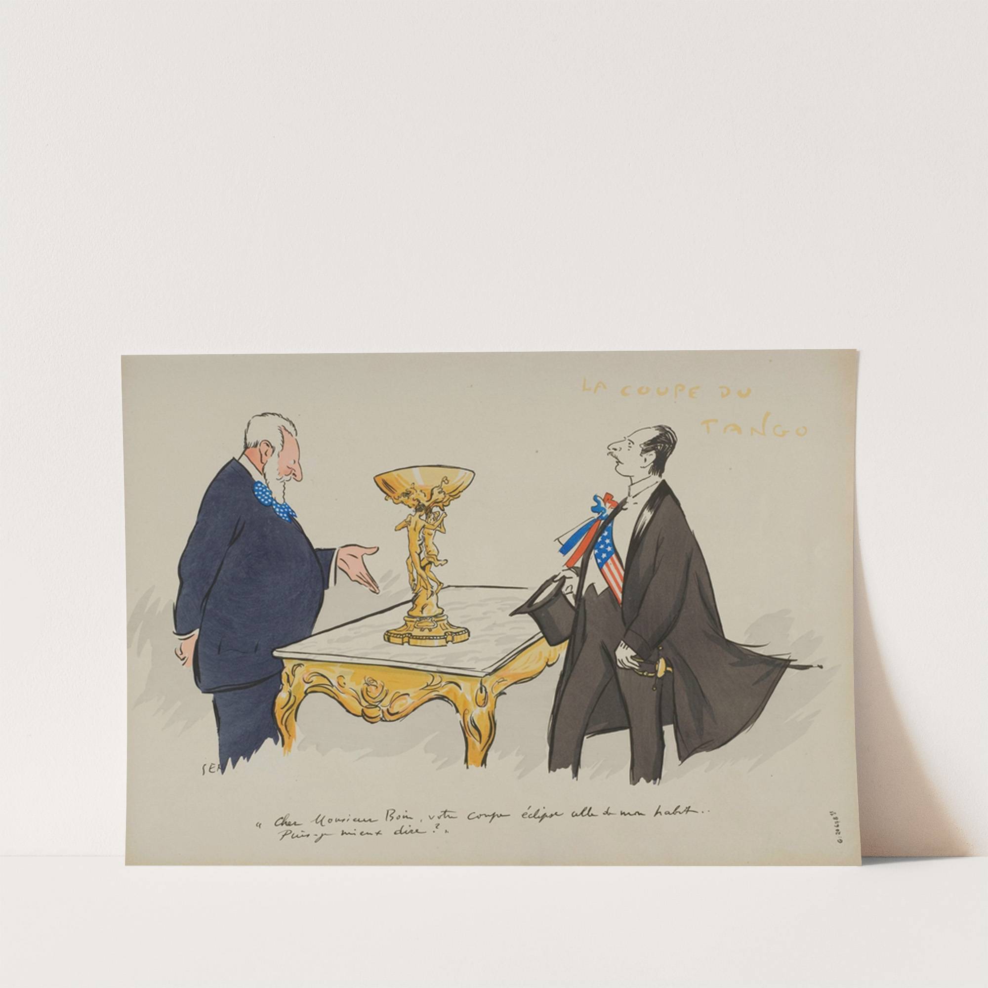 This vibrant art print depicts a humorous and thought-provoking scene titled "La coupe du Tango" by artist Georges Goursat. The illustration features two figures standing on either side of an ornate golden table with intricate carvings, centrally positioned. On the...