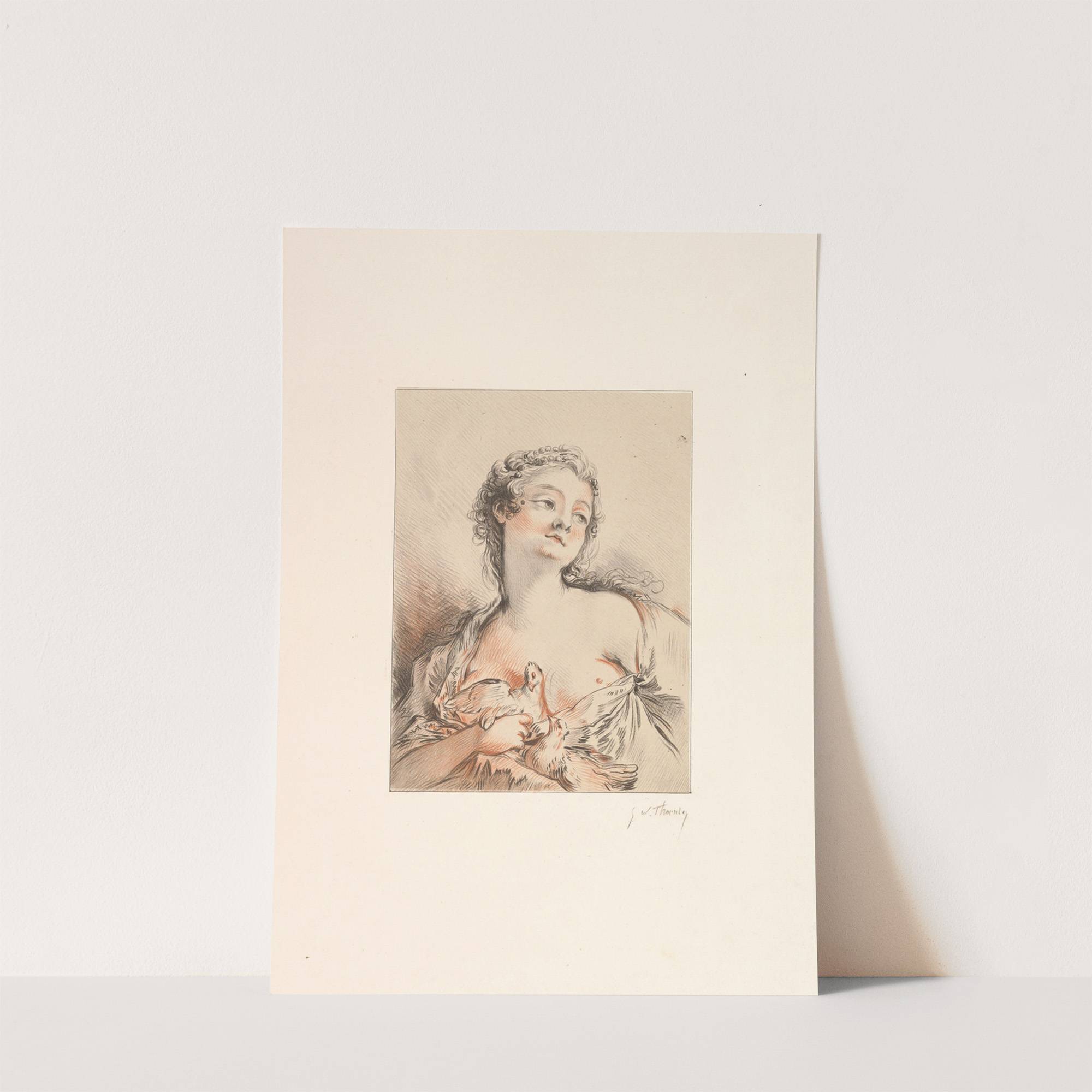 This elegant art print features "Half-length of a Woman Holding Two Chickens" by Georges William Thornley. The piece showcases delicate pencil and watercolor techniques to create a soft, yet detailed portrayal of the subject. The woman has fair skin and...