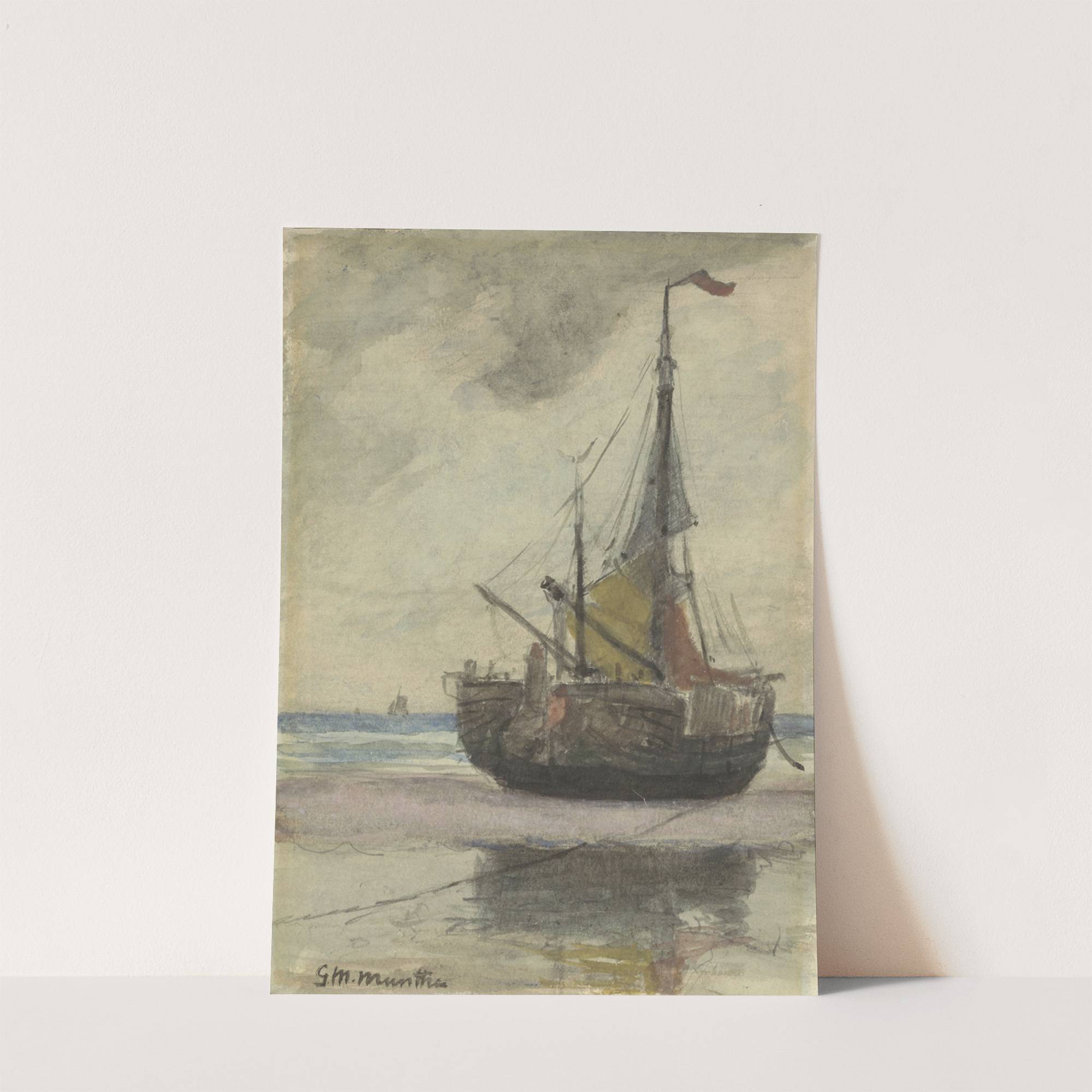Vissersboot op het strand met gereefd zeil by Gerhard Munthe  - Wall Art Print