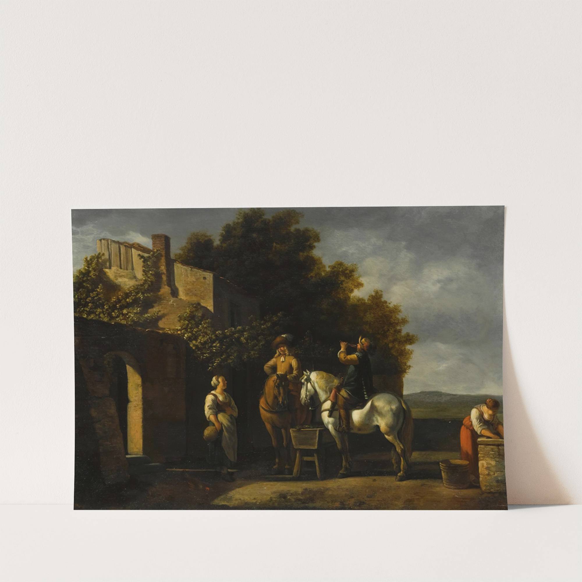 Cavaliers On Horseback Resting Outside An Inn With A Courtyard Beyond by Gerrit Adriaensz. Berckheyde - Wall Art Print