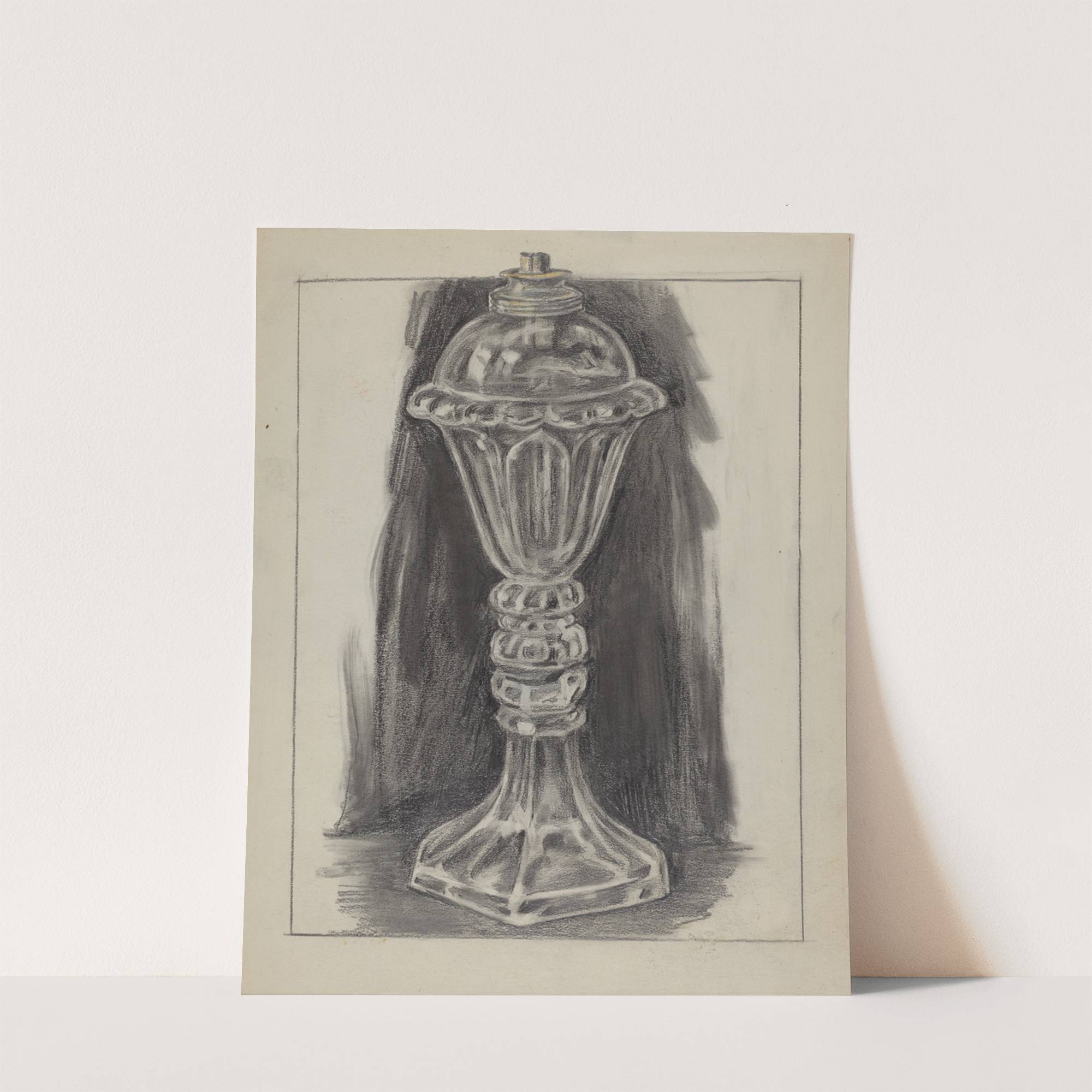 This art print features a detailed drawing of a classic lamp by artist Gilbert Sackerman. The illustration showcases the lamp with exquisite clarity, capturing its elegant, vintage design in a monochromatic palette. The lamp has a clear glass dome-shaped shade...