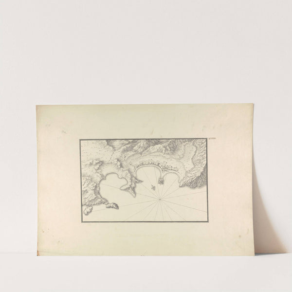 This art print features "Topographical Map of Halicarnassus at its Harbor" by Giovanni Battista Borra, showcasing a detailed black-and-white etching with delicate line work and intricate shading. The central focus includes three prominent cloud-like forms, which are intricately outlined and...