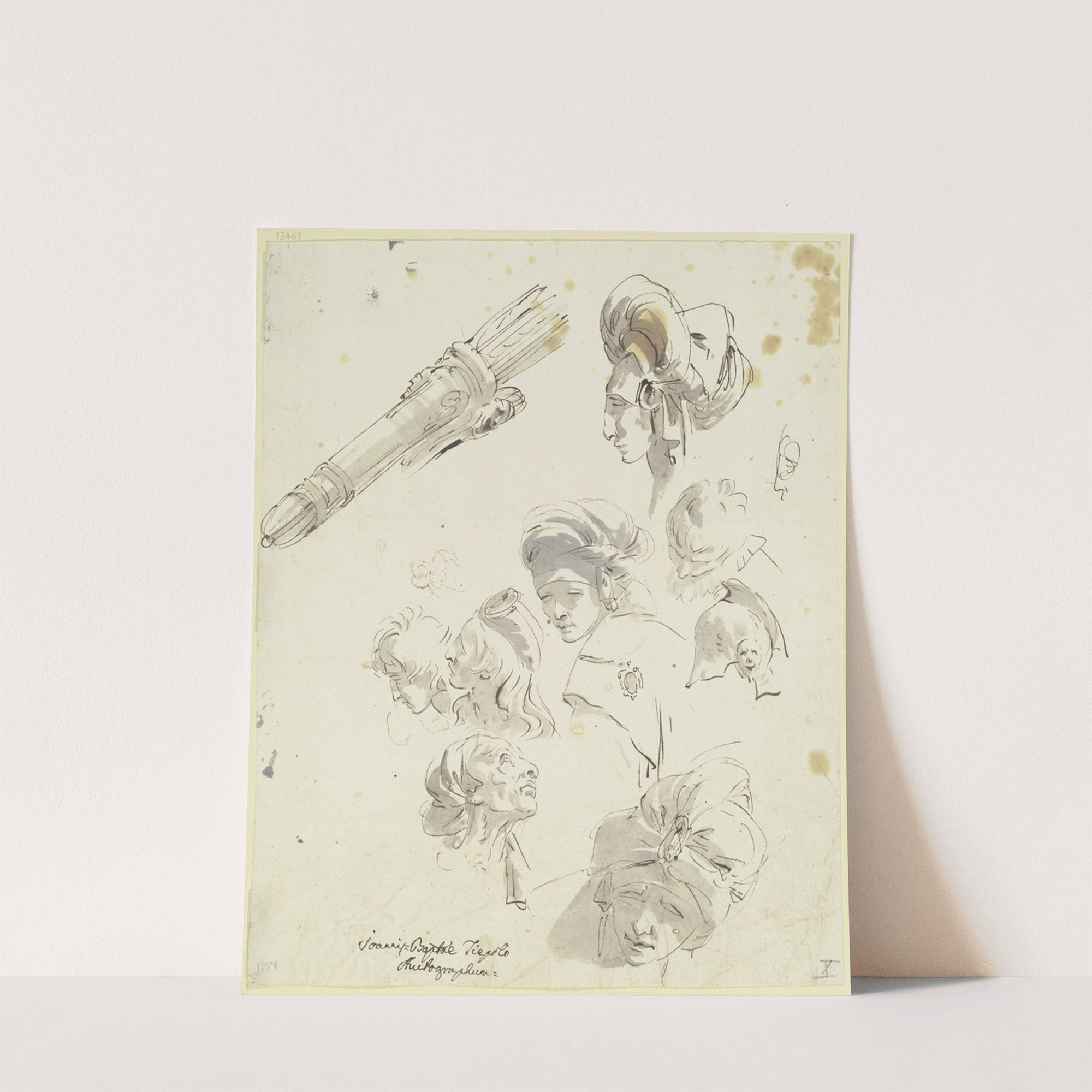 Verschiedene Köpfe von bartlosen Männern mit turbanartigem Kopfputz; links oben ein Köcher mit Pfeilen by Giovanni Battista Tiepolo - Wall Art Print