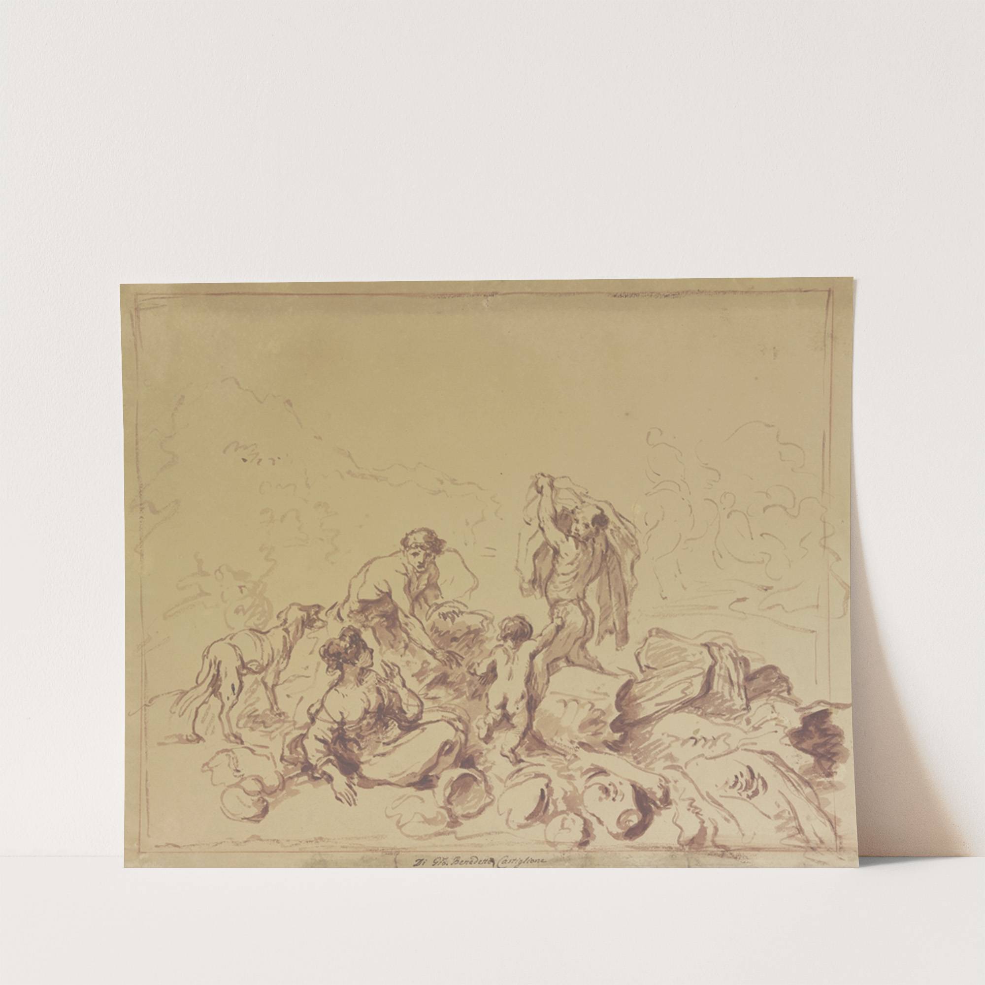 Zwei Männer, Frau und Kind an einer Wasserstelle zwischen antiken Architekturfragmenten by Giovanni Benedetto Castiglione - Wall Art Print