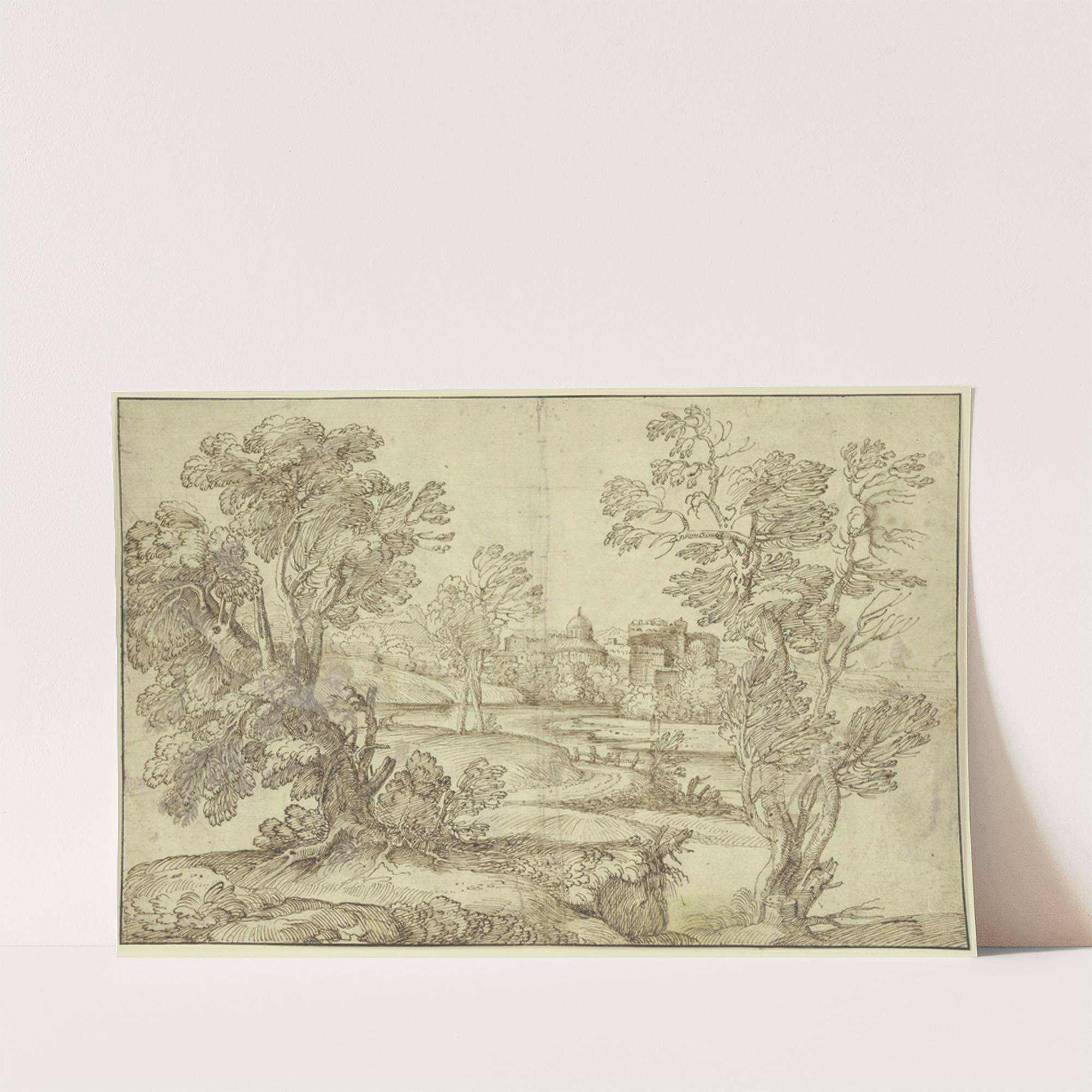 Landschaft mit Wasser, Baumgruppen und Gebäuden by Giovanni Francesco Grimaldi - Wall Art Print
