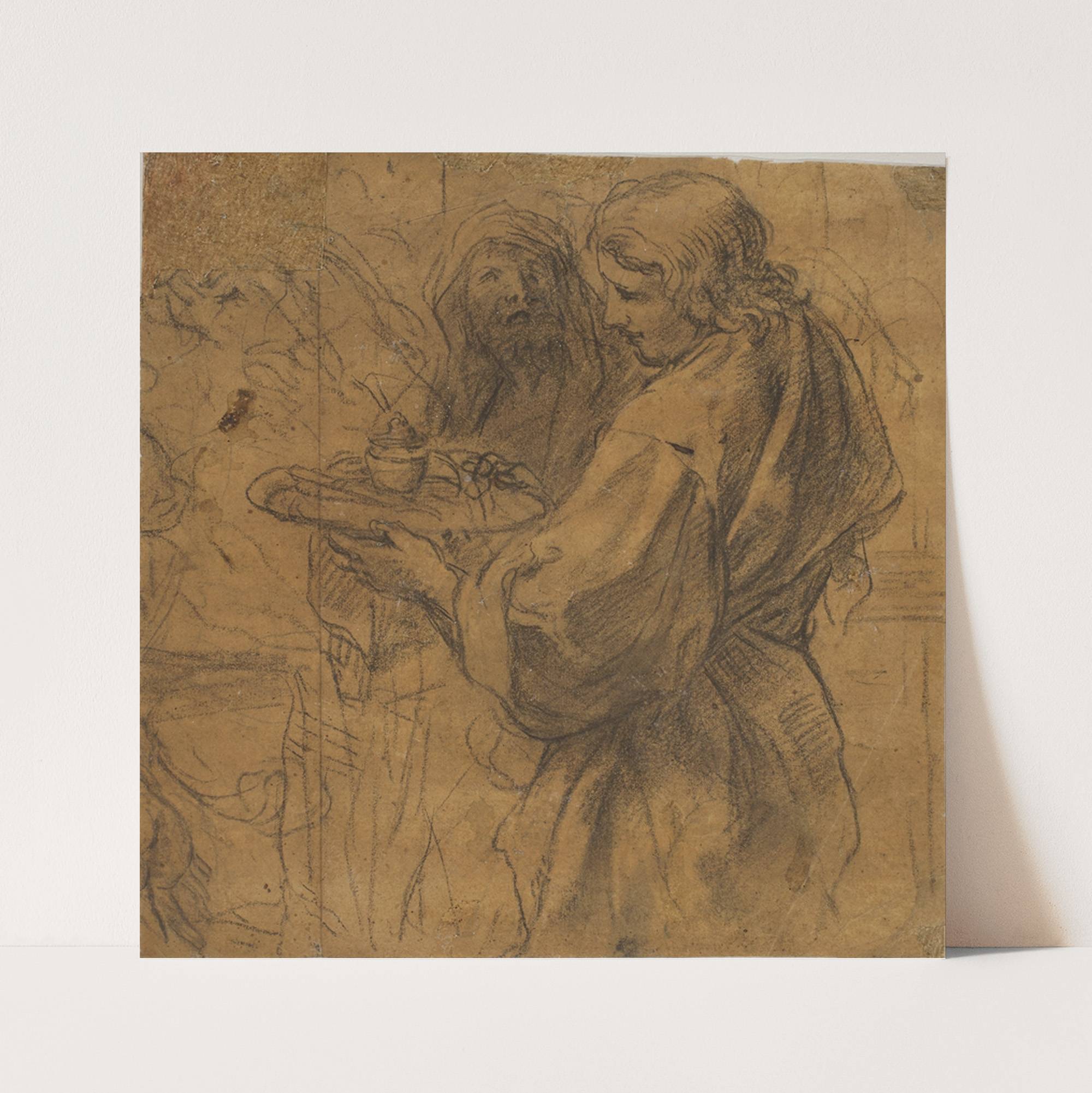 En ung mand med en bakke og bag ham en ældre mand med draperet hoved by Girolamo Troppa - Wall Art Print