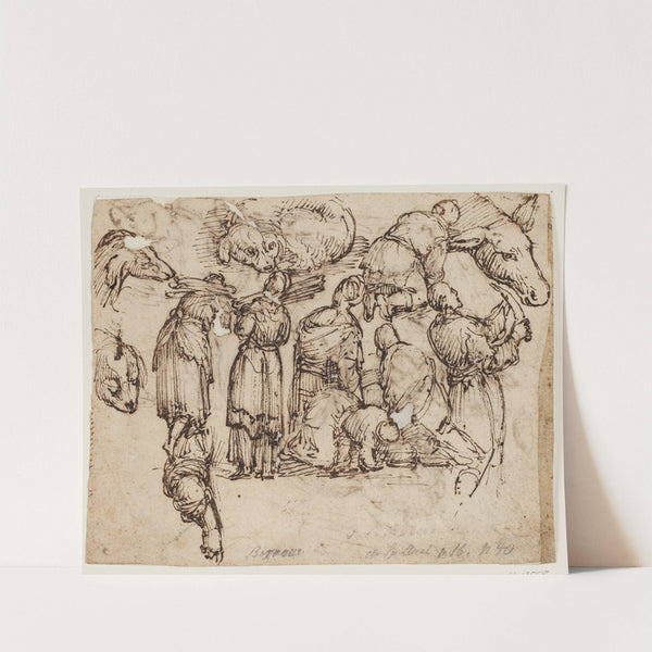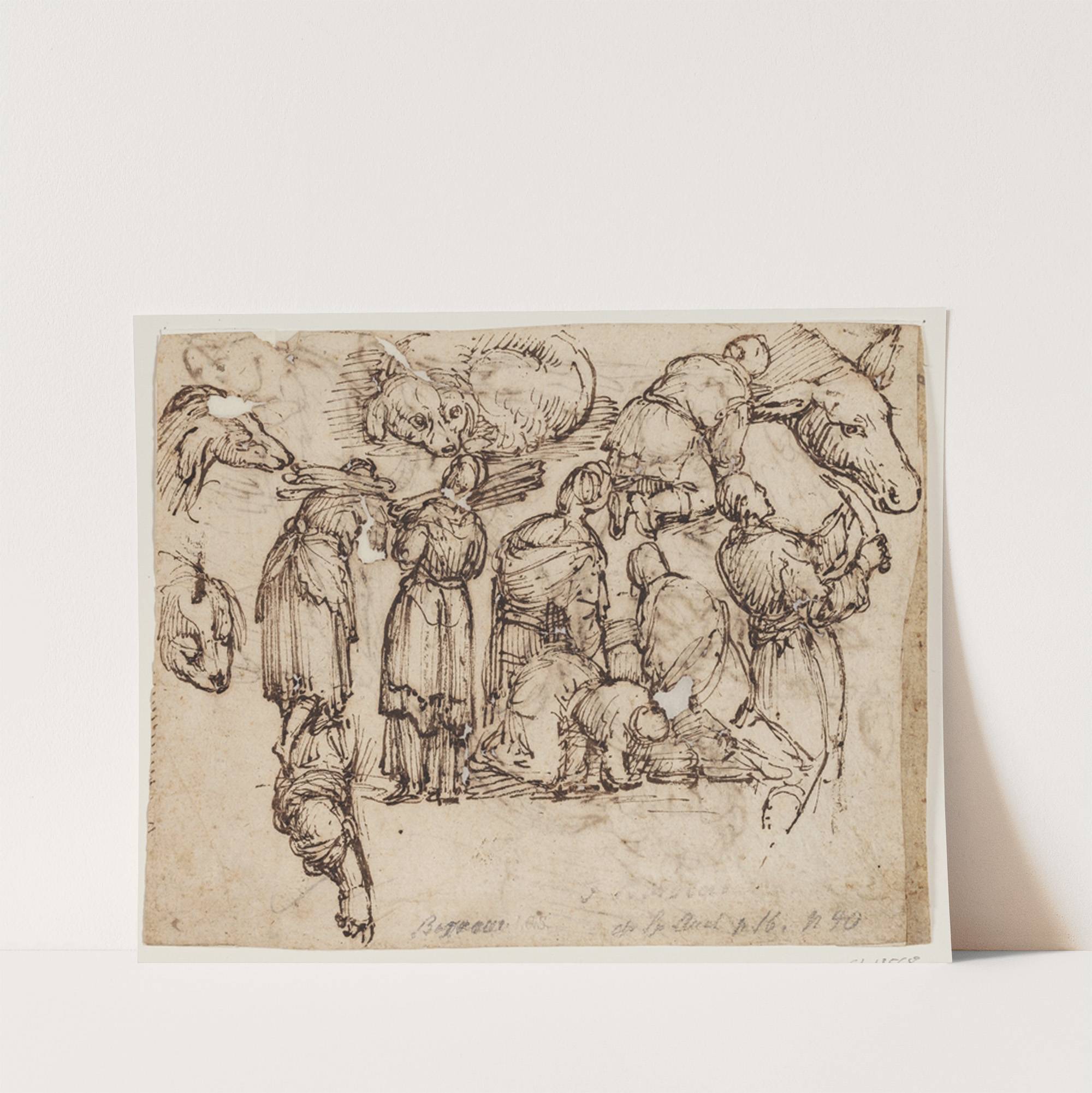 Diverse studier til i alt 7 personer Bla til kvinder, der bærer knipper, og til en mand med en kniv, samt til et æsels- og to hundehoveder og en liggende hund by Giulio Cesare Procaccini - Wall Art Print