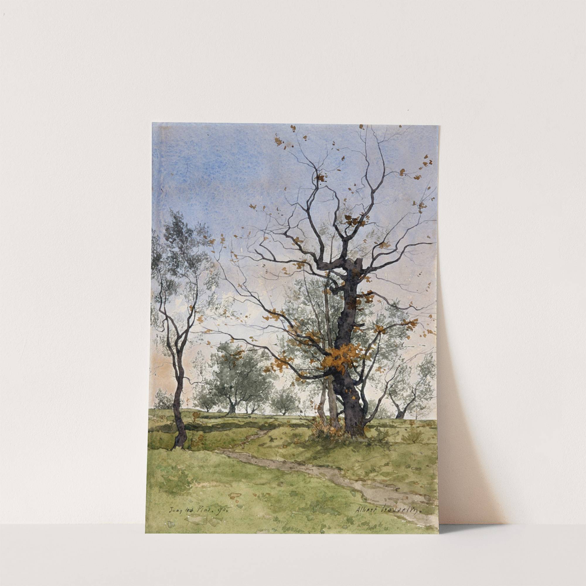 This beautiful art print showcases "Chêne et oliviers à Juan-les-Pins" by artist Albert Gosselin. The piece captures the serene beauty of a gently sloping hillside, where tall, slender trees with dark, twisted trunks stand amidst a backdrop of soft, green...