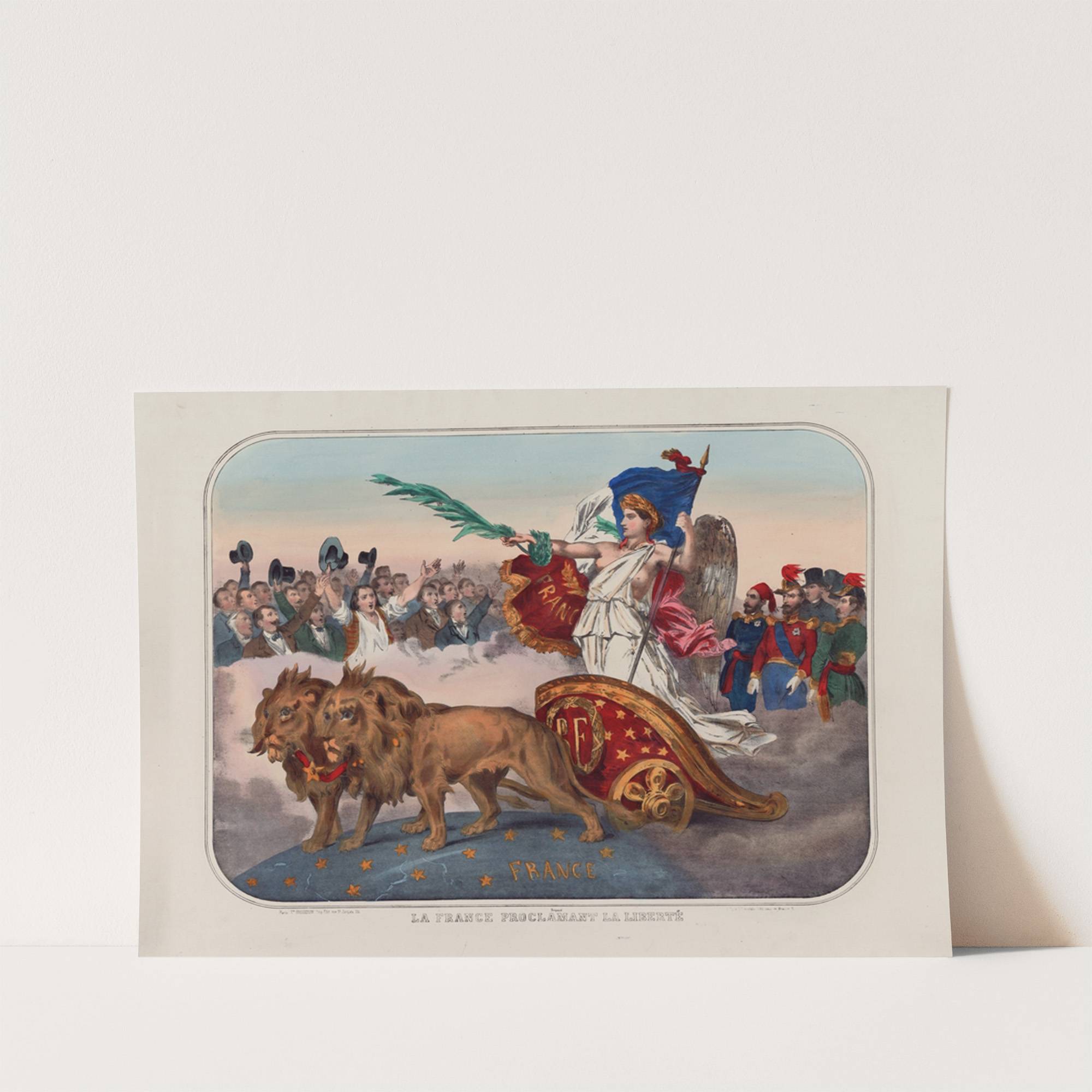 This vibrant illustration, "La France proclamant la Liberté" by artist Gosselin, brings to life a dramatic scene of French revolutionaries proclaiming liberty. At the center, a regal figure in flowing white robes and a blue headpiece raises her arm triumphantly,...