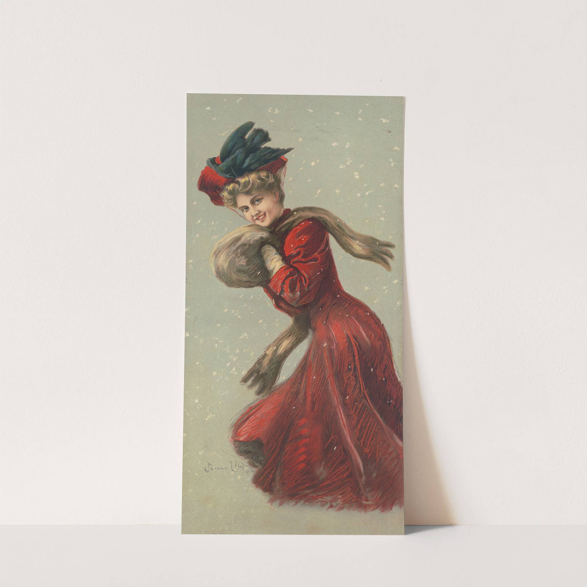 Woman wearing red coat and hat with fur muffler in the snow by Gray Litho. Co - Wall Art Print