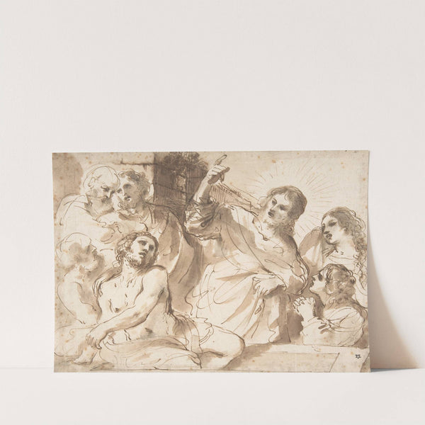 This artwork is a classic Baroque drawing titled "The Raising of Lazarus" by Guercino, capturing the biblical moment with dynamic movement and expressive lines. The composition centers on Jesus, depicted with a gentle yet authoritative demeanor as he raises his...