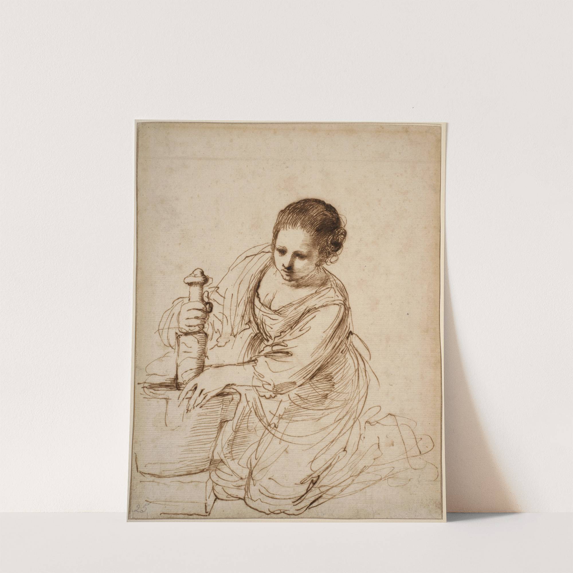 Woman on her knees holding a pestle and a mortar by Guercino - Wall Art Print