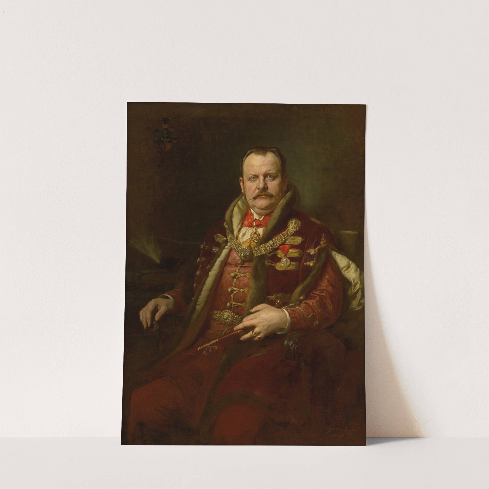 This regal portrait captures the dignified presence of a nobleman in a meticulously detailed painting by Gyula Stetka titled "Aurel Münnich." The central figure is an older man with a fair complexion, slightly balding head, and a prominent mustache. His...
