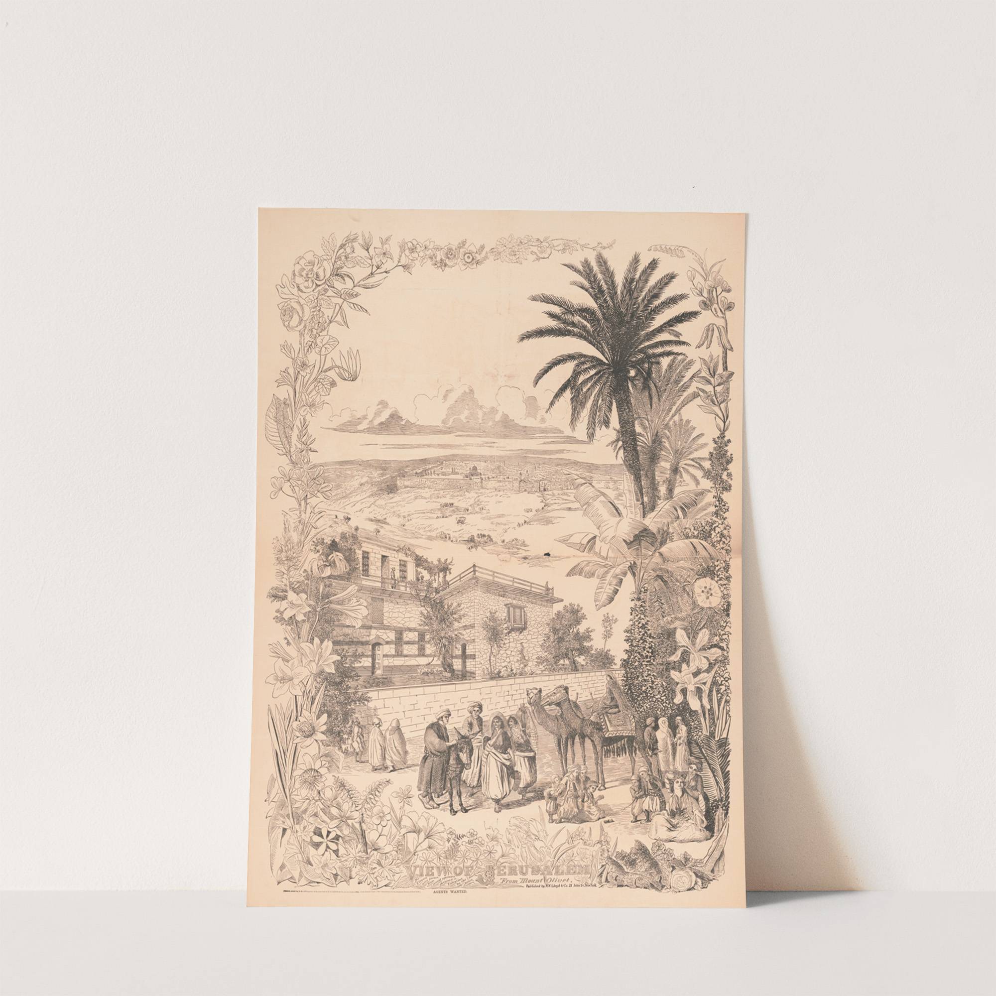 This beautifully intricate black-and-white illustration captures "View of Jerusalem from Mount Olivet" by H.H. Lloyd & Co. The scene is rich in detail, featuring a bustling rural village set against the backdrop of rolling hills and distant mountains. A prominent...