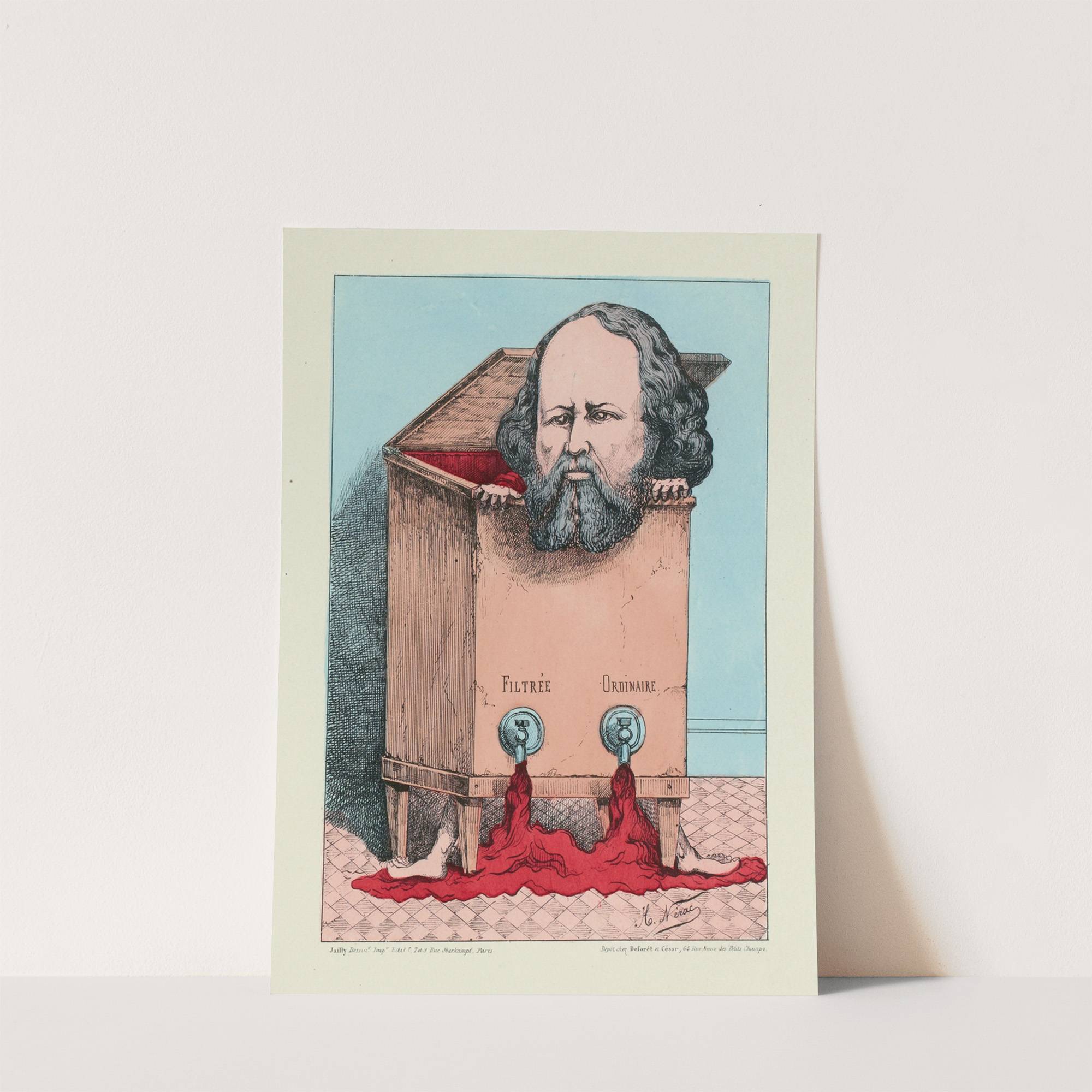 This satirical print features a humorous illustration of a bearded man with a balding head, depicted as emerging from a cardboard box labeled "Flutteee" and "Jonrame." His facial expression is serious, but his situation is absurdly comical: his face and...