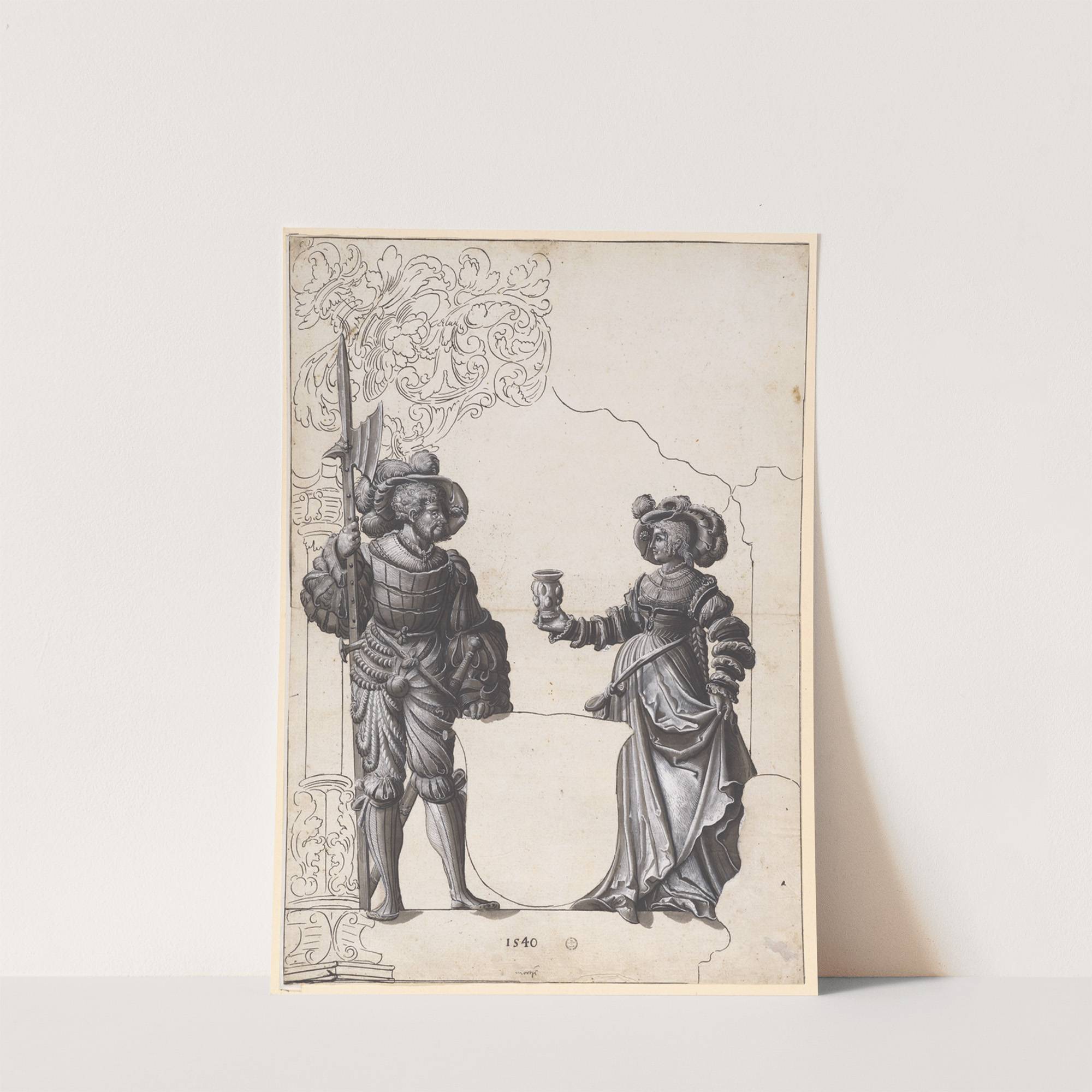Scheibenriss mit Frau, die einem Hellebardier den Willkommtrunk reicht, und leerem Wappenschild by Hans Rudolf Manuel - Wall Art Print