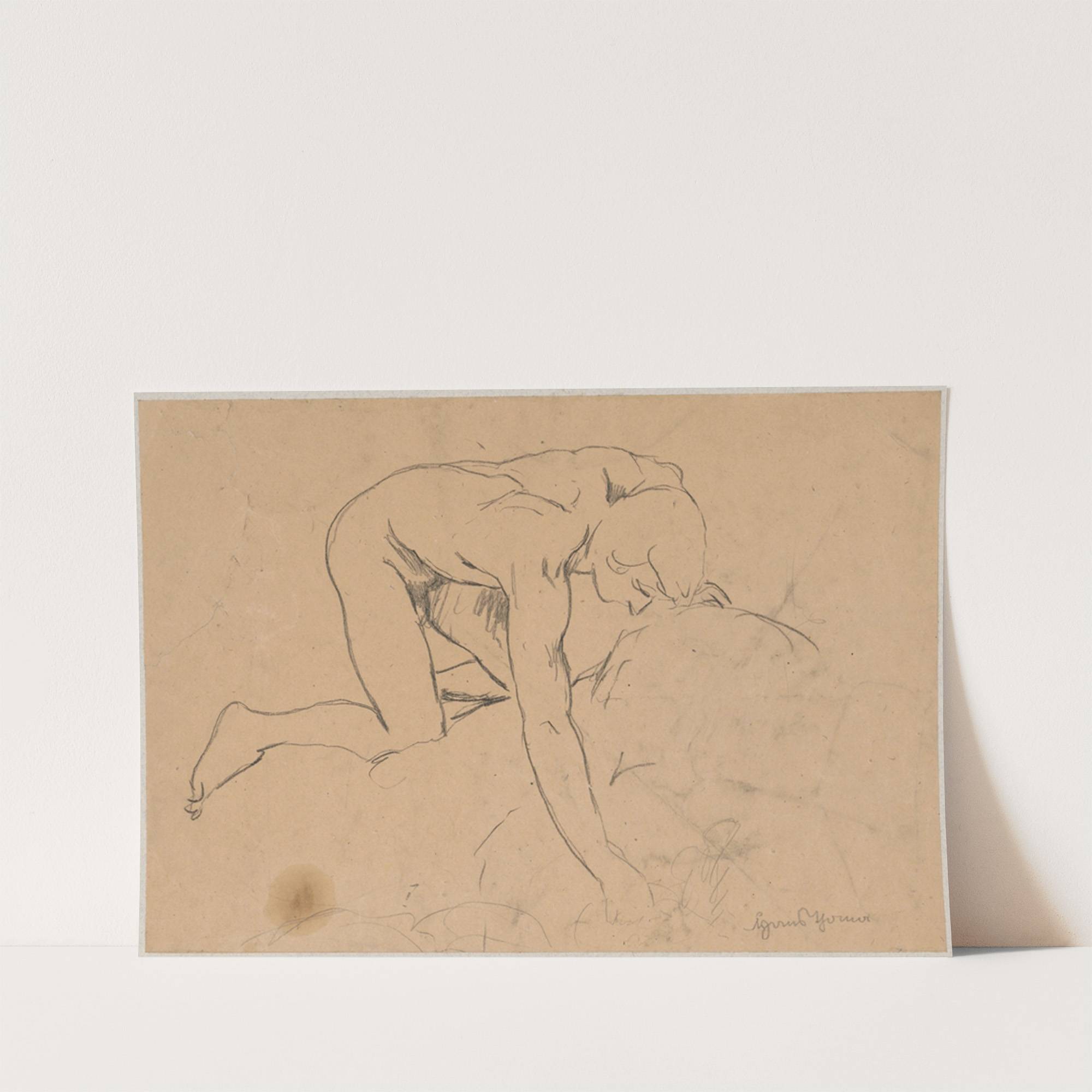 Naked young man kneeling on a rock and reaching out to a spring with his hand (1890 - 1910) by Hans Thoma - Wall Art Print