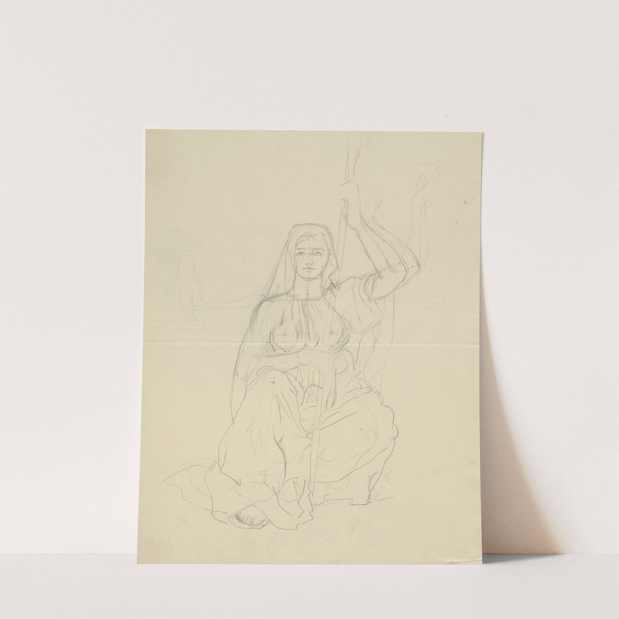 Sitting woman in a long antiquate robe holding a stick in her hands. Design for a bookplate (1880 - 1920) by Hans Thoma - Wall Art Print