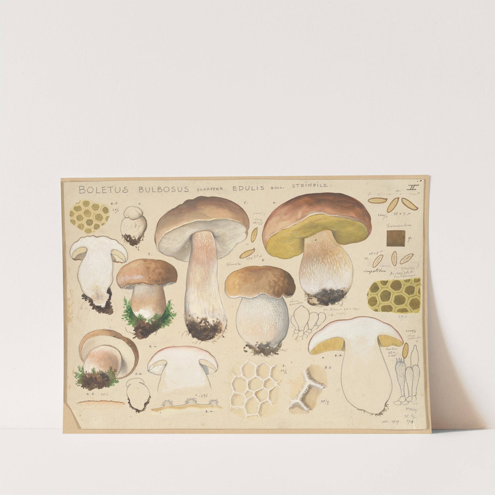 Explore the fascinating world of fungi with this detailed botanical illustration titled "Boletus bbulbous, Edulis & Sterilis" by Hans Walty, created in 1915-1945. This meticulously crafted artwork features a range of Boletus species in varying stages and perspectives. The mushrooms...