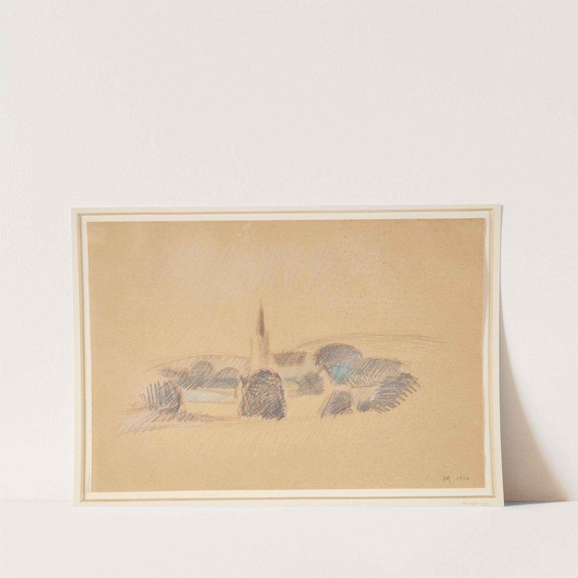 This artwork is "Udsigt mod Svanninge Kirke" by Harald Giersing, presented in a soft, warm-toned monochromatic palette. The piece utilizes subtle shades of blue and brown against an almost peach-colored background, creating a serene and contemplative atmosphere. The scene depicts...