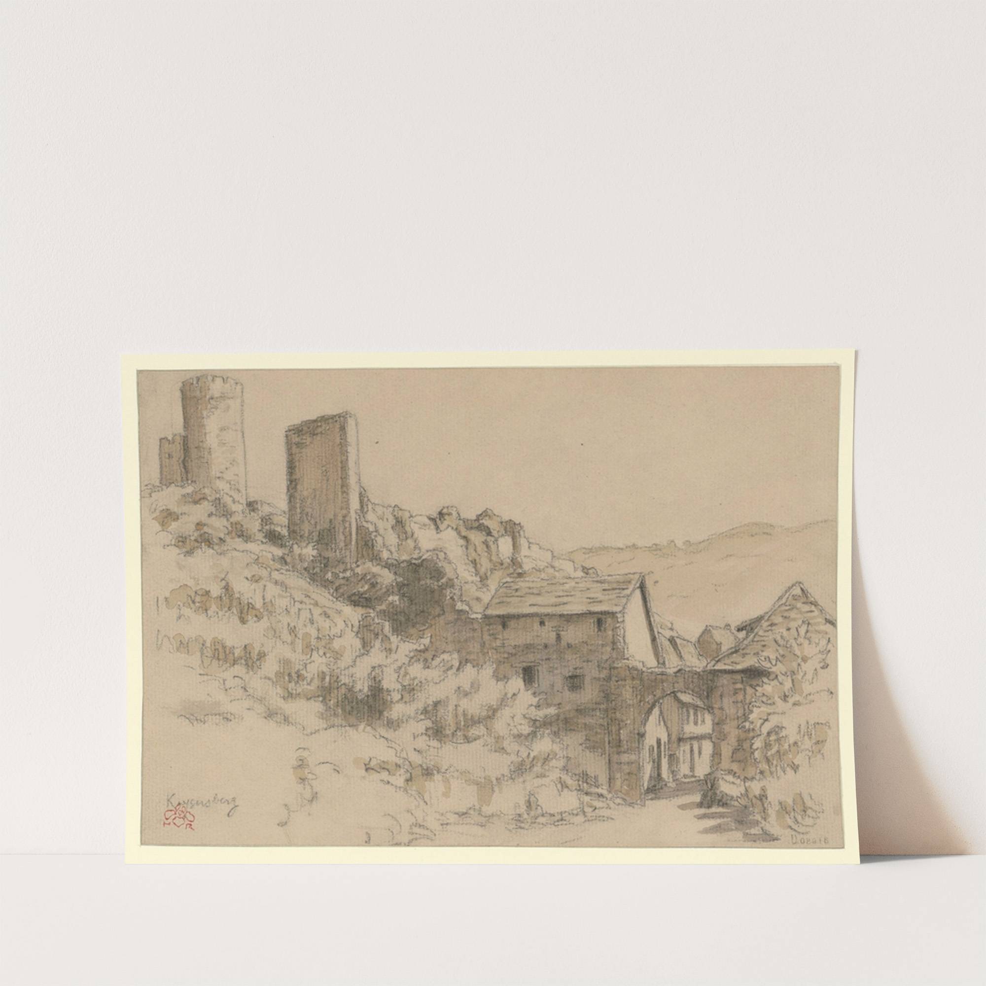 This exquisite print features "Kaysersberg (1919)" by the renowned artist Henri Rivière, captured in meticulous sepia tones. The scene depicts an ancient stone village perched atop a rugged hillside. In the foreground, there is a rustic, weathered barn with a...
