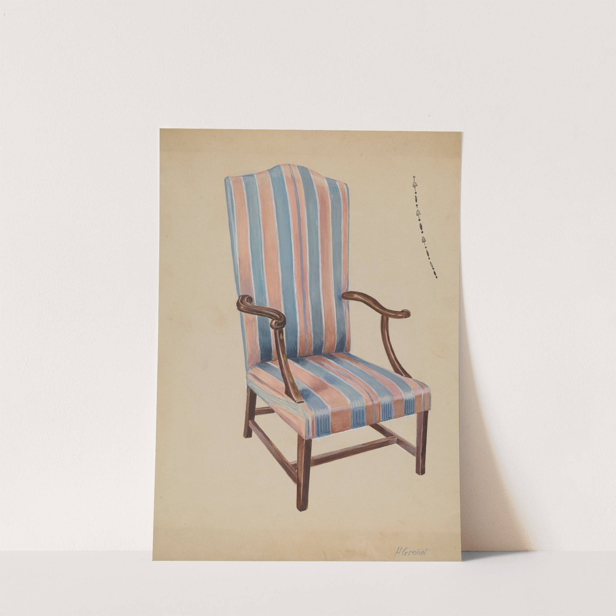 This charming piece of art features "Chair" by artist Henry Granet, showcasing a beautifully illustrated armchair. The chair is adorned with vertical stripes in varying shades of blue, pink, and beige, creating a vibrant and eye-catching pattern. The dark wood...