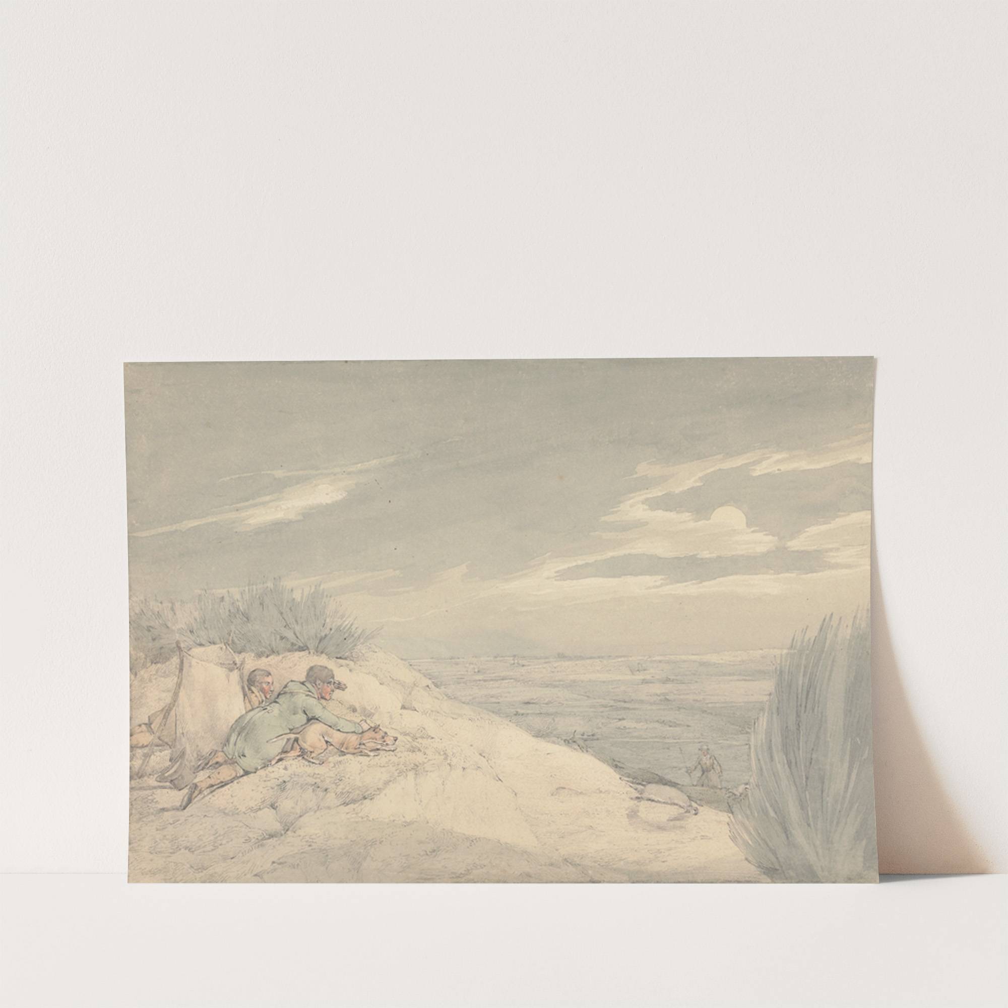 Experience the tranquility of "The National Sports of Great Britain" 1821: Badger Catching by Henry Thomas Alken. This delicate watercolor painting captures a serene moment on a sandy beach, bathed in soft natural light. Two figures are positioned in the...