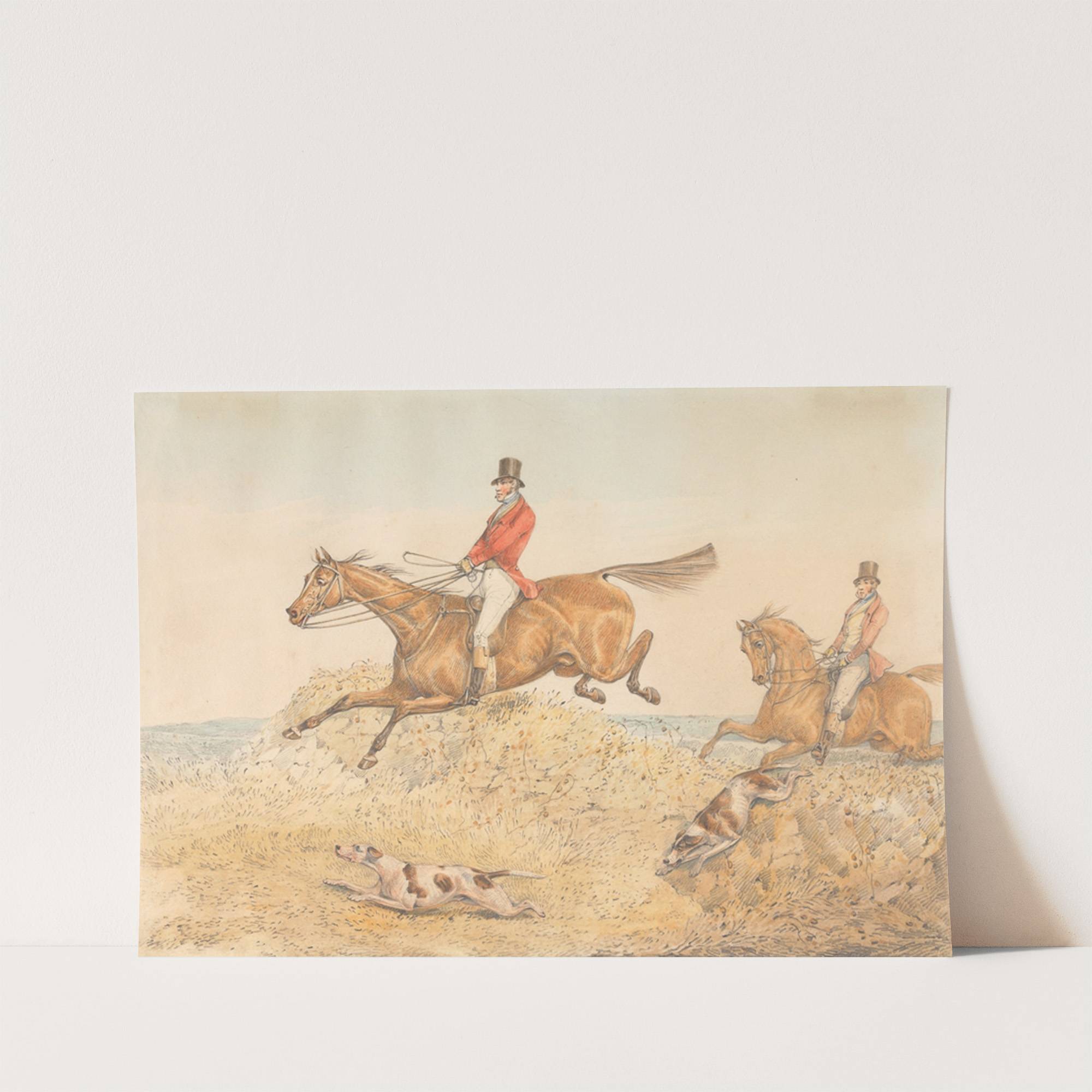 Two Riders and a Couple of Hounds Clearing a Wall by Henry Thomas Alken - Wall Art Print