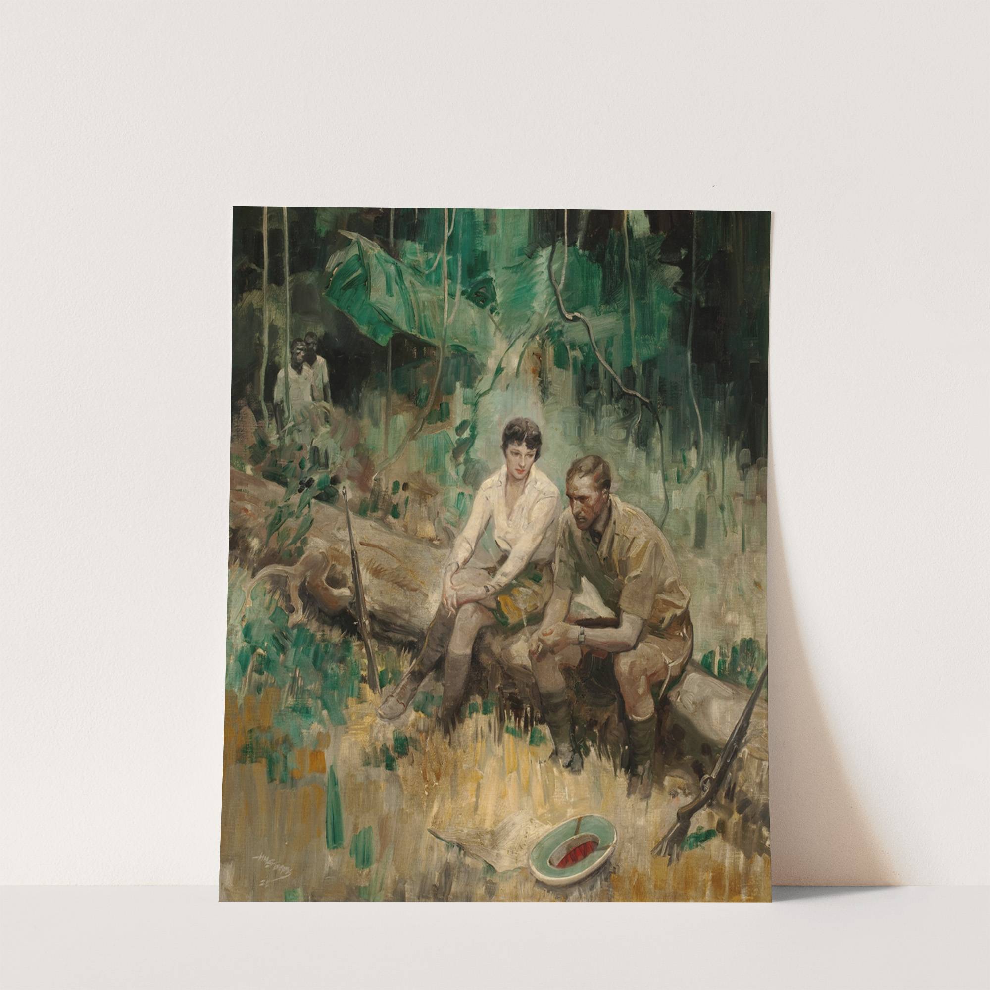 This art print features "Break from the Hunt" by Herbert Morton Stoops, capturing an evocative moment in a dense forest setting. The painting portrays two men resting beside a large fallen tree amidst lush green foliage and undergrowth. The man...