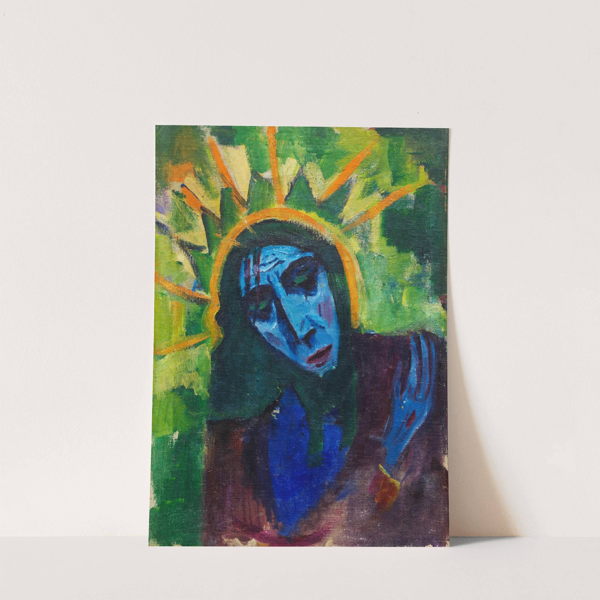 This vibrant, expressive art print features "Christuskopf" by Hermann Stenner, a modern abstract representation of Jesus Christ. The central figure is rendered in bold, deep blue hues with a hauntingly realistic yet stylized face. His eyes are closed, and his...