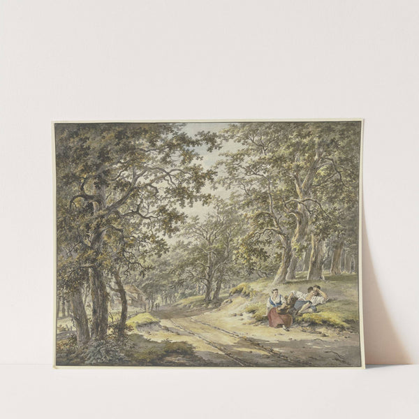 Weg durch den Wald an einem Gehöft vorbei, vorn ein ruhender Bauer und Bäuerin mit ihren Körben by Hermanus van Brussel - Wall Art Print