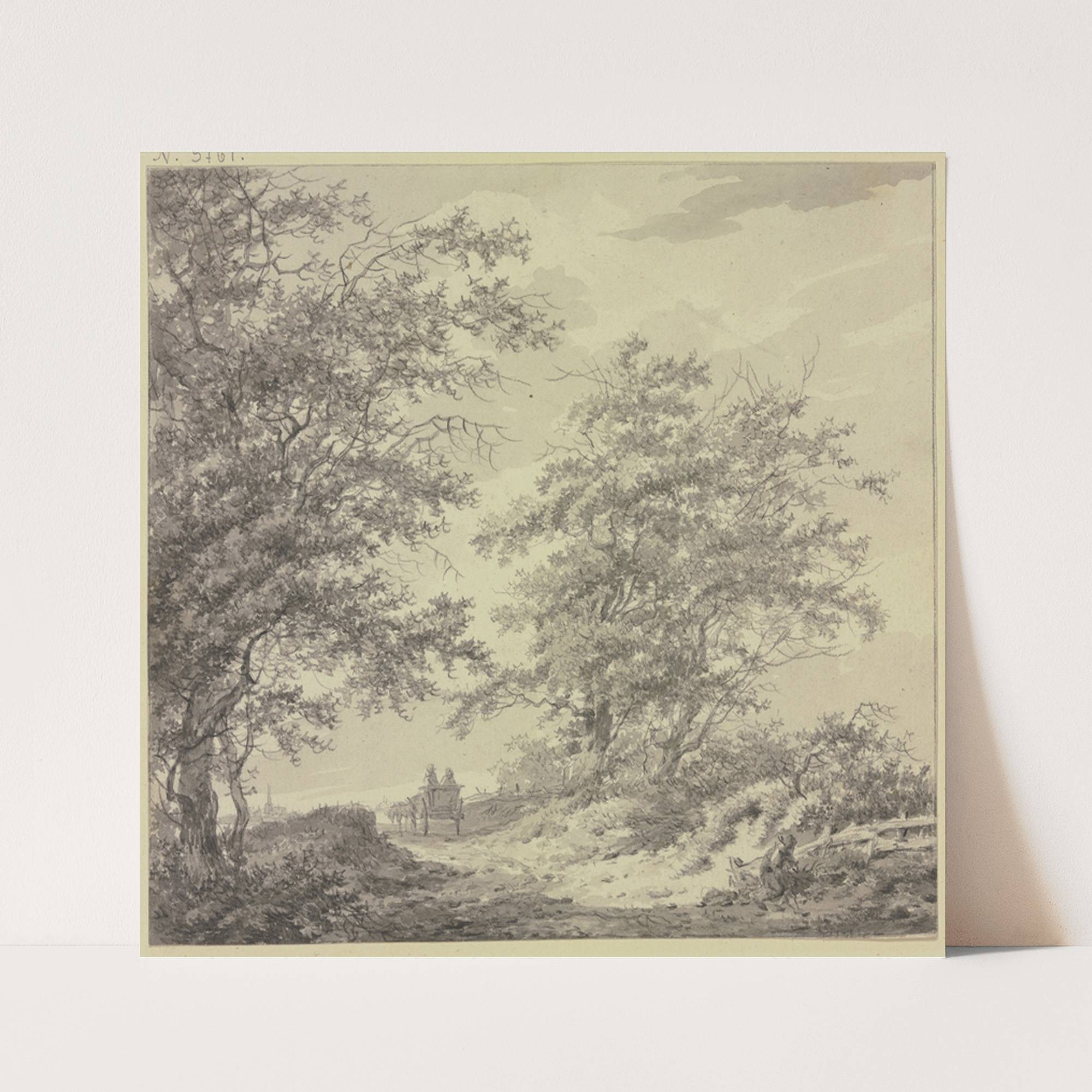 Weg zwischen zwei Baumgruppen mit einem Wagen, rechts am Zaun ein sitzender Mann by Hermanus van Brussel - Wall Art Print