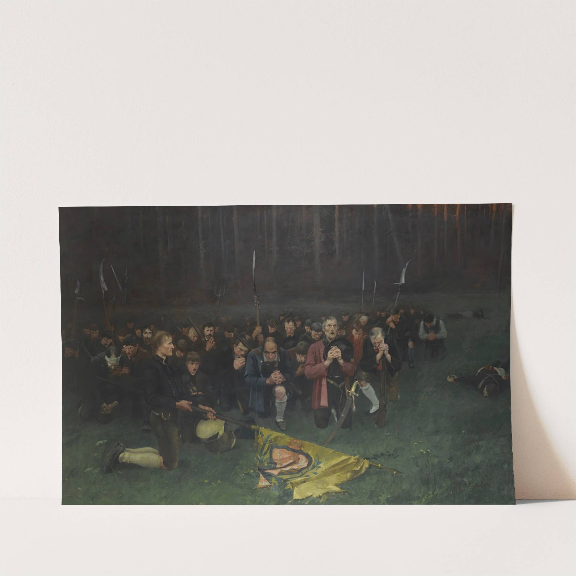 This striking artwork by Albin Egger Lienz is titled "Prayer after the Battle of Bergisel," capturing a poignant moment of reflection and solemnity among weary soldiers. The painting features a group of men, clad in dark military uniforms with red...