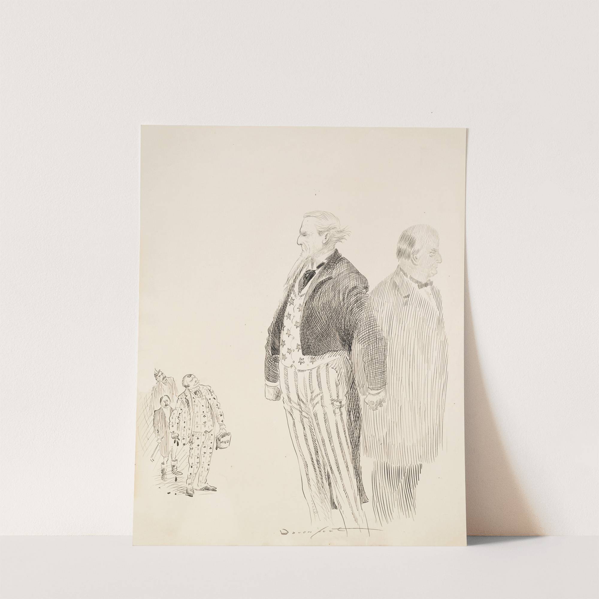 Uncle Sam stands guard between a gentleman and three men lead by a man carrying a bucket of mud and wearing a suit made of cards. by Homer Davenport - Wall Art Print