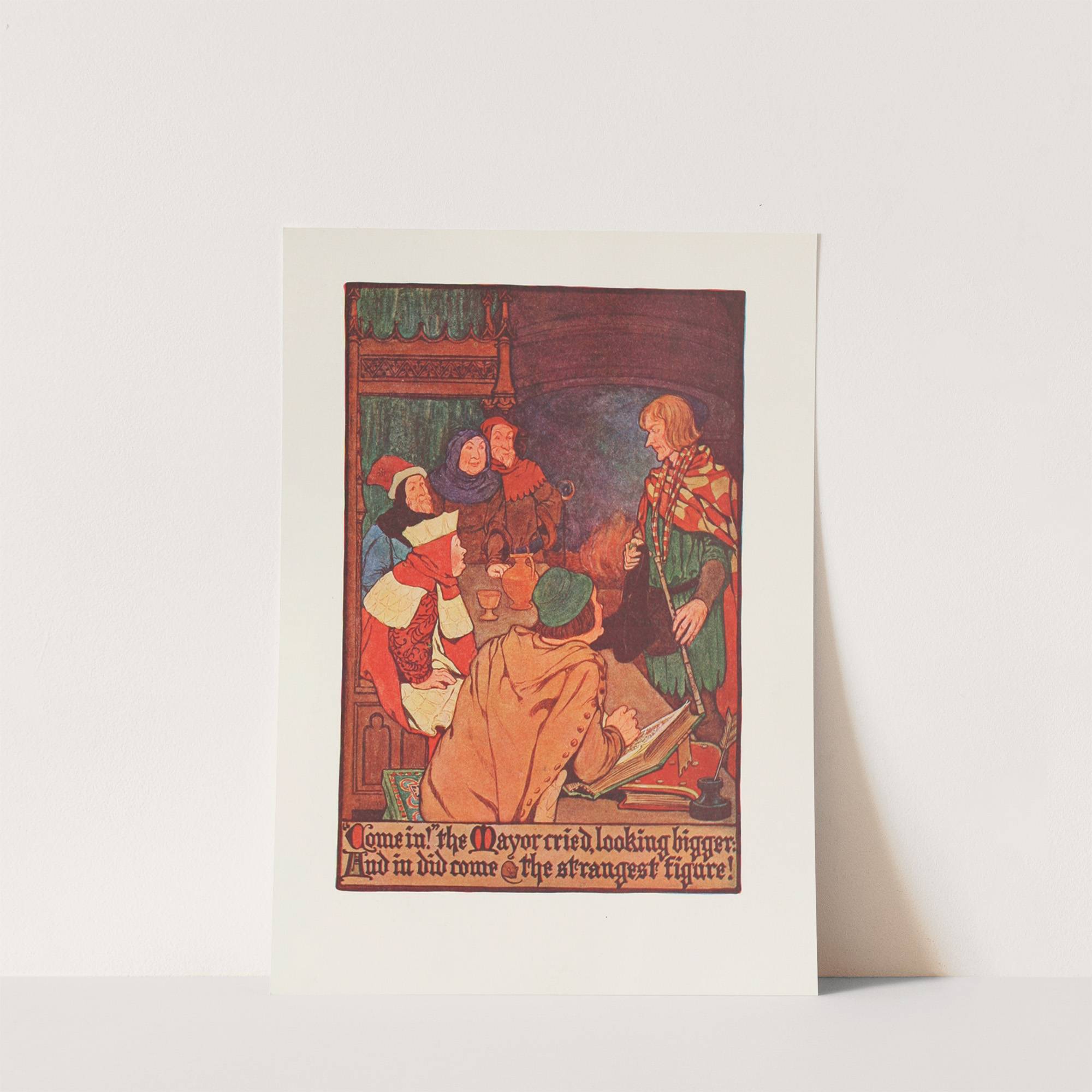 This vibrant print features "Come in! ? The Mayor cried, looking bigger; And in did come the strangest figure!" by Hope Dunlap. The colorful illustration portrays a lively scene set inside what appears to be a medieval hall. On the...
