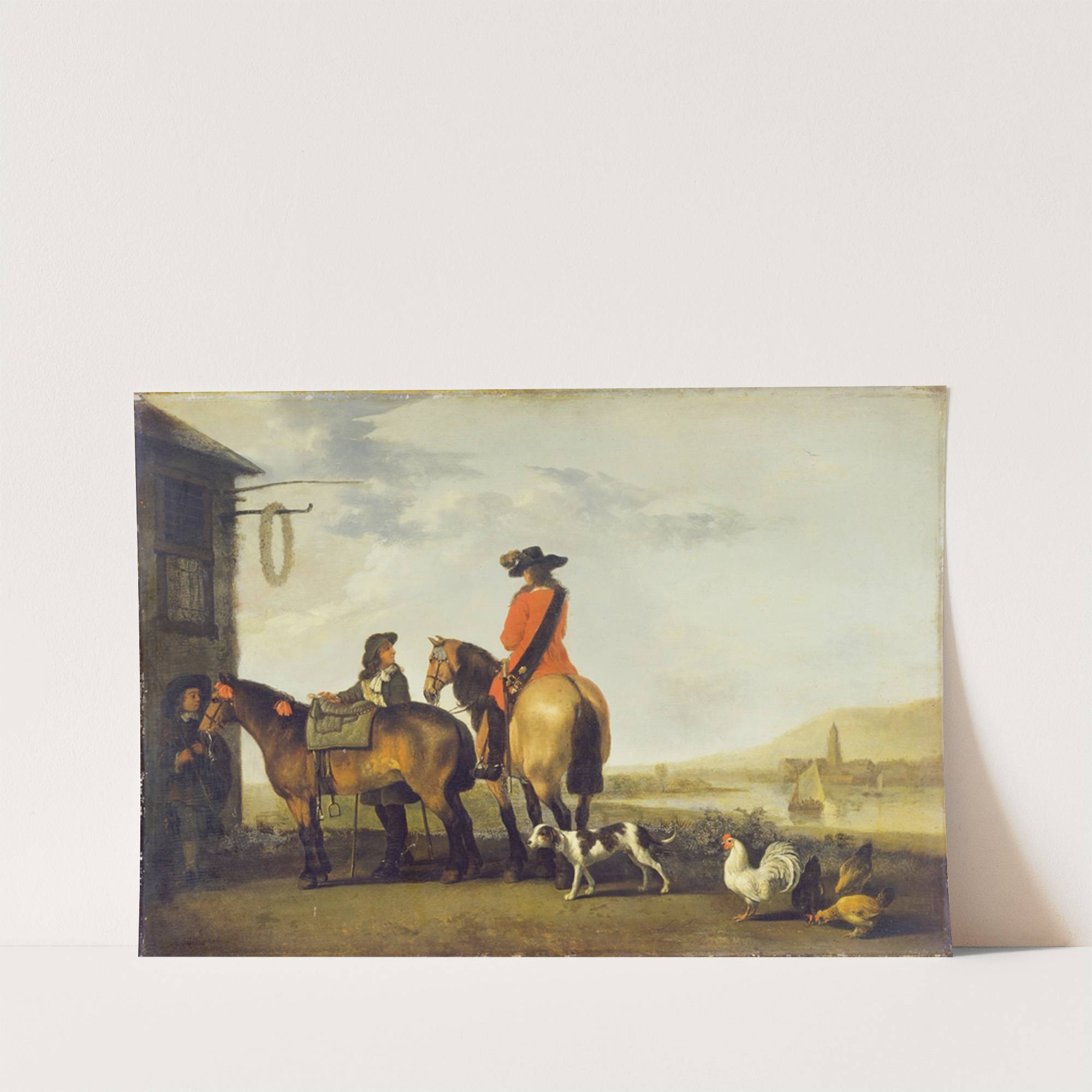 This art print features "Two Horsemen at a Tavern Netherlands" by Abraham Van Calraet. The painting captures a serene rural scene with two horsemen in period attire, standing near a rustic tavern. One horseman wears a bright red coat and...